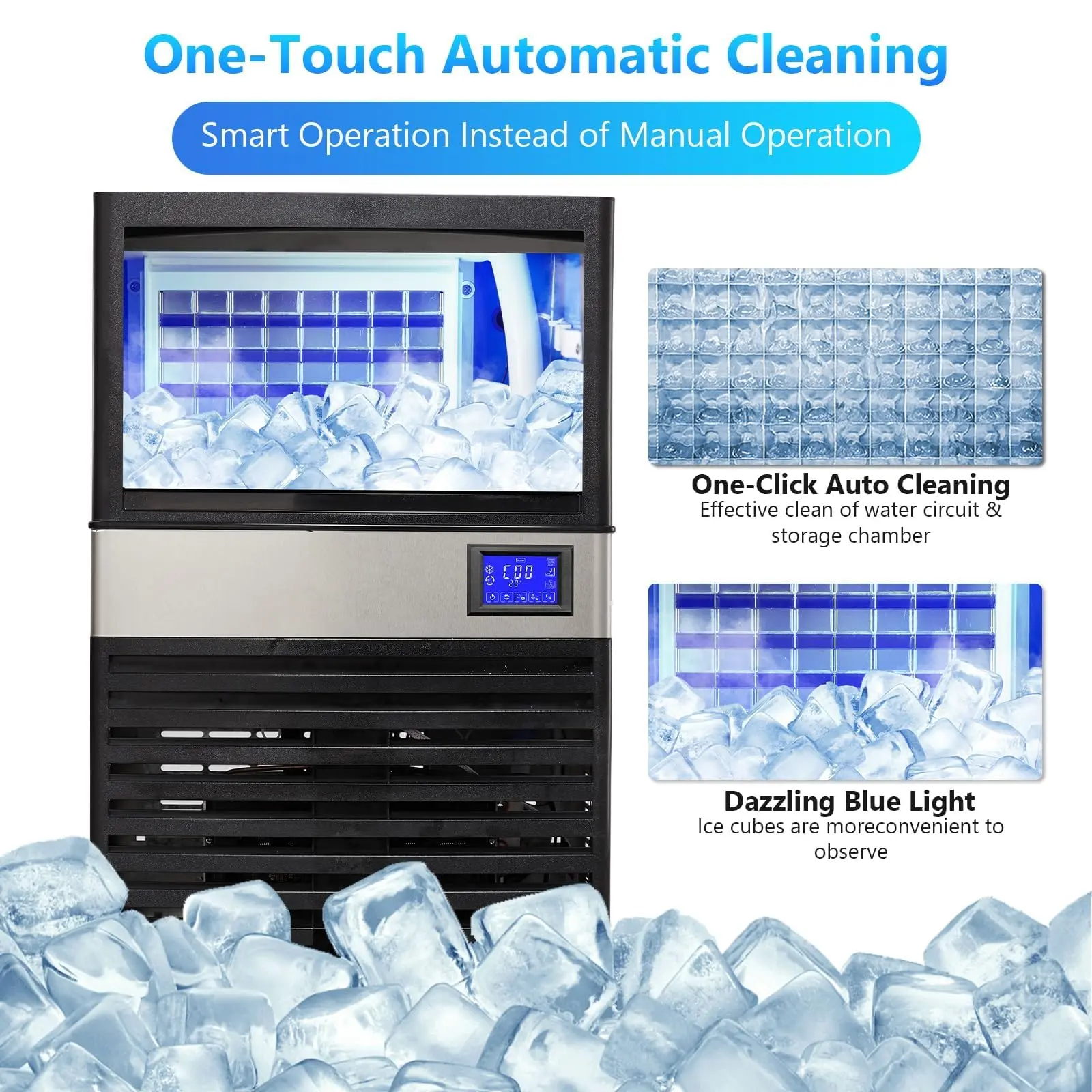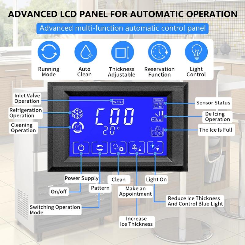· ✔️Smart LCD Control Panel for Easy Operation:Adjust ice thickness and set timers effortlessly with the intuitive LCD display. A one-touch cleaning function simplifies maintenance, while the auto-shutoff feature ensures safety and convenience.