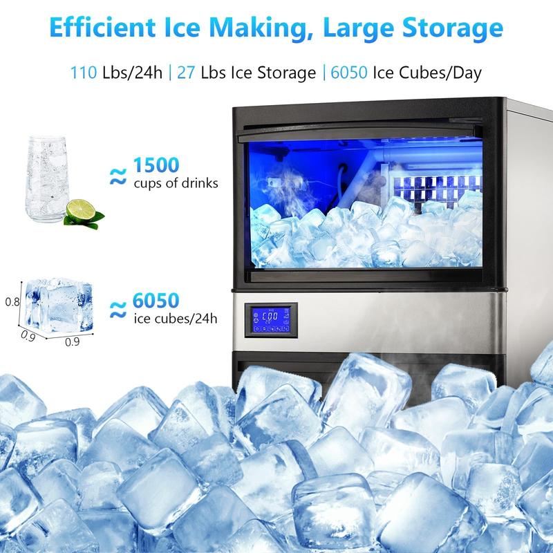 · ✔️High-Capacity Commercial Ice Maker:Our under counter ice maker can produce 110 lbs of ice per 24 hours with 55 clear ice cubes every 10-20 minutes, ideal for high-demand settings-enough for busy bars, restaurants, or large households. . The 27-lb storage bin keeps ice ready for use, and you can easily break ice sheets for extra storage in your freezer.