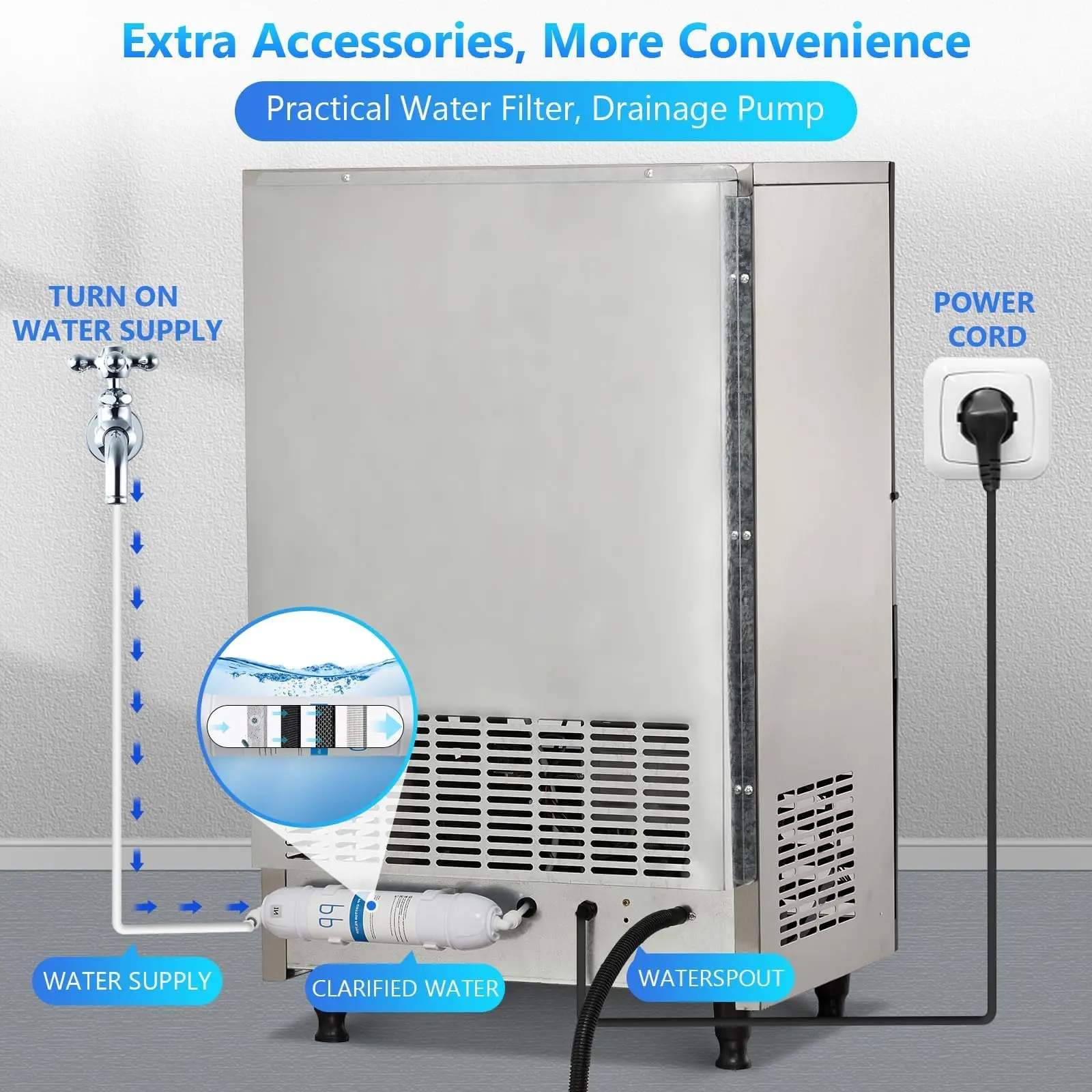 · ✔️Complete Setup with Drain Pump & Filter:Ice Production comes with an electric drain pump, ice scoop, and water inlet/outlet hoses for hassle-free installation. The built-in water filter ensures clean, crystal-clear ice—perfect for drinks and food service.