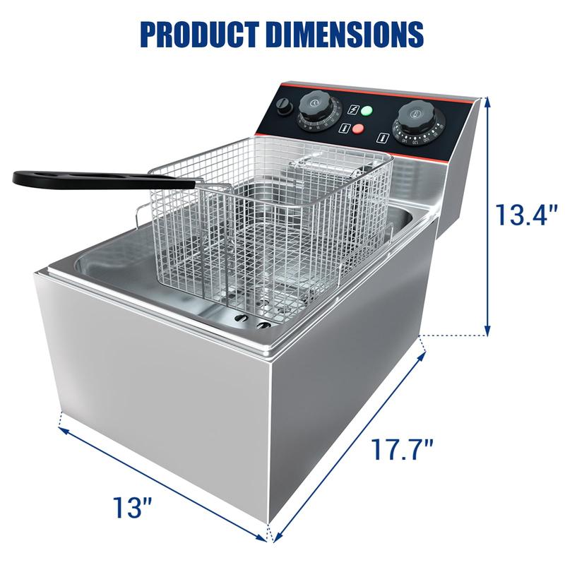 · SIZE AND PACKAGE INCLUDE: There is 1* deep fryer ,1* basket,1* oil tank and 1* lid in the package. The counter-top electric deep fryer is 13 x 17.7 x 13.5 in. Max capacity is 11.5 Qt/11 L. NOTE: For safety reasons, please do not fill the basket more than halfway