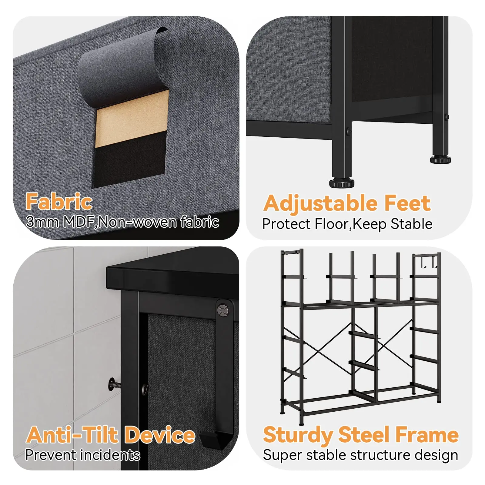 · Built to last, the dresser boasts a sturdy steel frame, a waterproof wood top, and a heavy-duty metal frame with X-frame backing. Stability is further enhanced with an anti-tip kit and adjustable feet to protect your floors.
