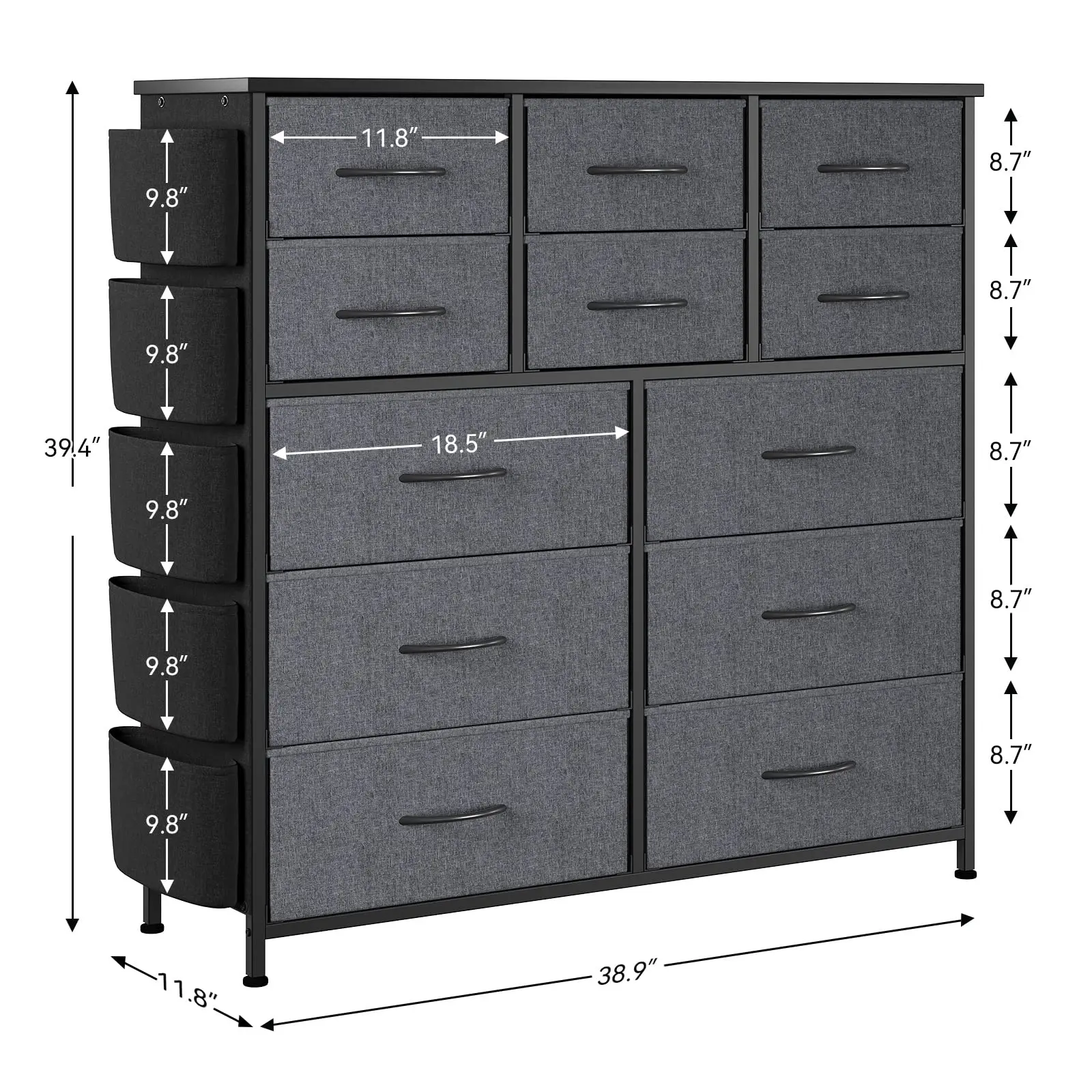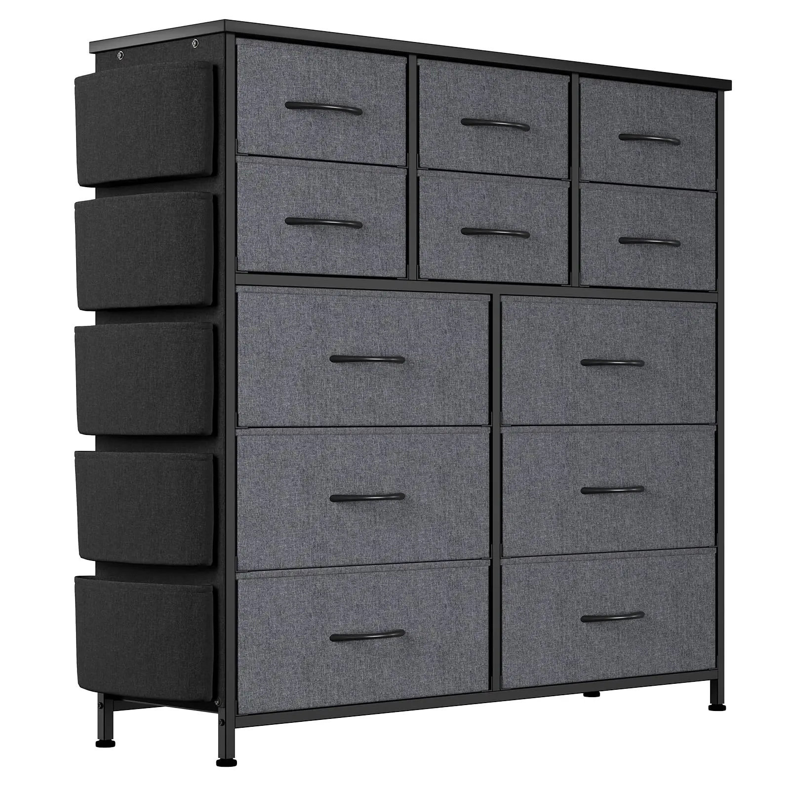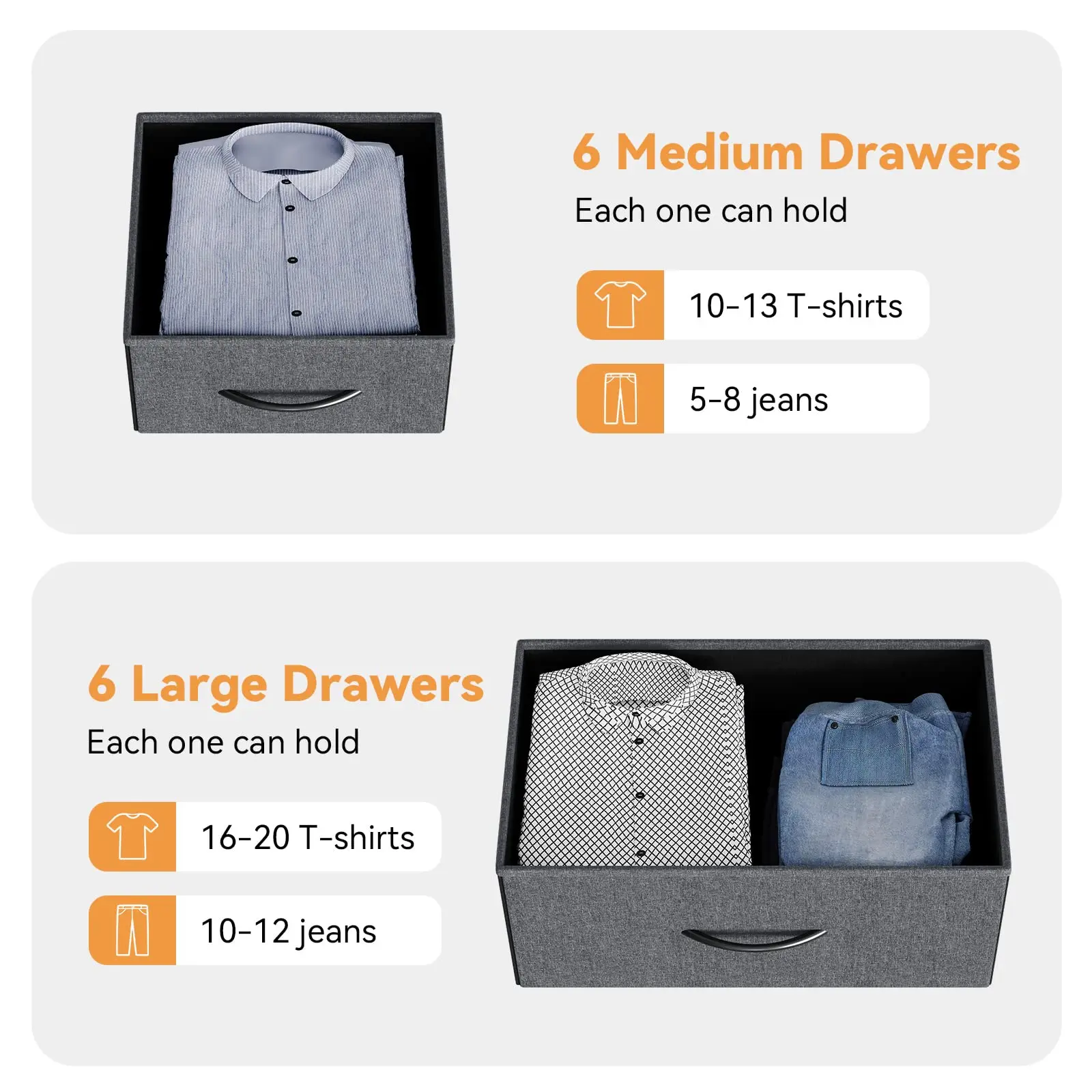 · Enjoy unparalleled storage capacity with 12 collapsible fabric drawers, including 6 for small items, 2 with dual compartments for medium items, and 6 large drawers for larger belongings. This dresser provides endless organizational possibilities for your needs.