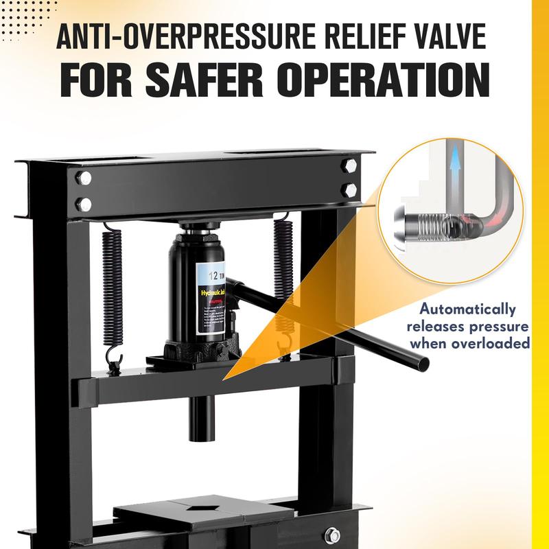 · --Built-In Protection: Designed for safety, the automatic relief valve activates at 12 tons to protect the benchtop hydraulic press from damage. This feature enhances durability, allowing you to confidently tackle heavy-duty applications