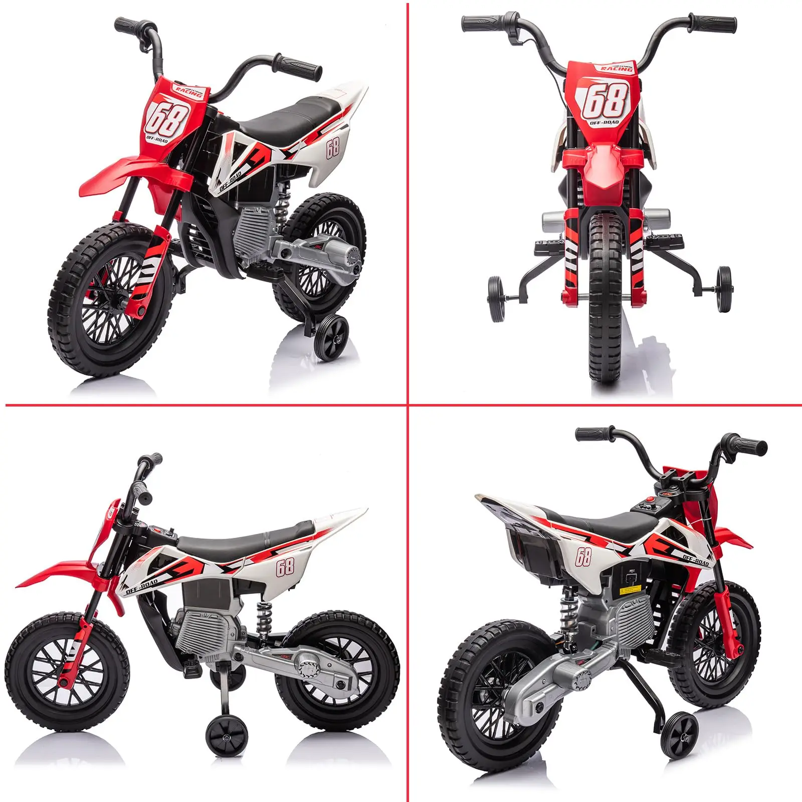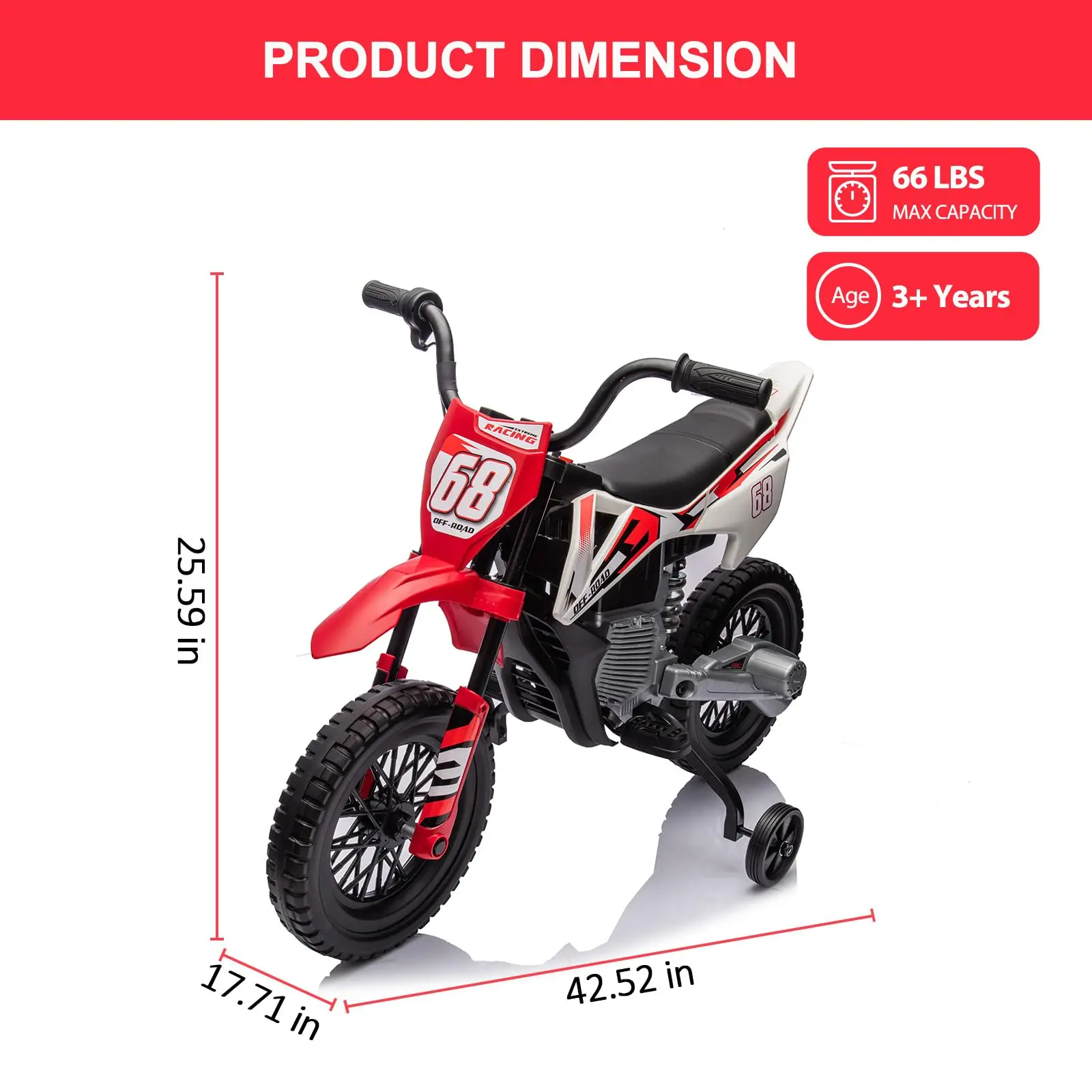 · Dirt Bike Details: Overall Dimensions: 42.52 inches (L) x 17.71 inches (W) x 25.59 inches (H). Maximum Weight Limit: 66 lbs. Recommended Age: 4-8 years.