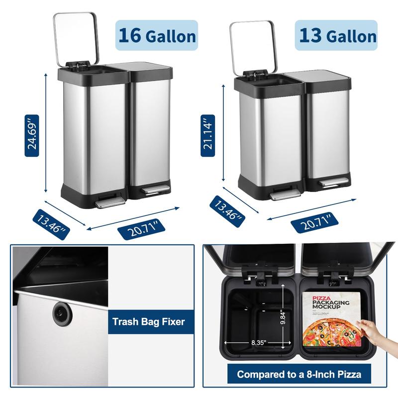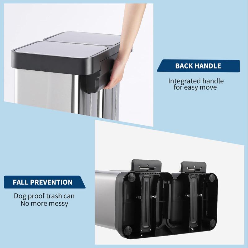· Silent Dual Compartment Operation: Experience noise-free waste disposal with soft-close lid technology and internal hinge design. The 13 gallon kitchen trash can prevents lid slamming, maintaining quiet in bedrooms/home offices while durable stainless steel resists fingerprints.