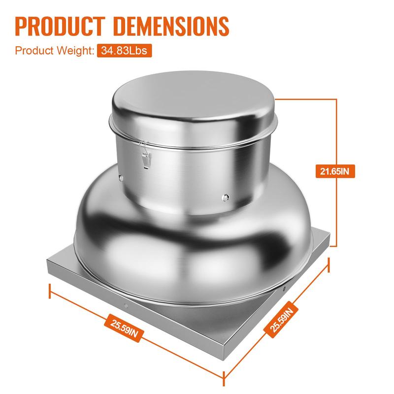 · 【Upgraded Motor for Reliability】: Featuring an upgraded motor, the Roof Exhaust Fan is built for durability and consistent performance. With a robust fan base measuring 25.59” x 25.59”, it provides stability and strength, making it suitable for demanding environments.