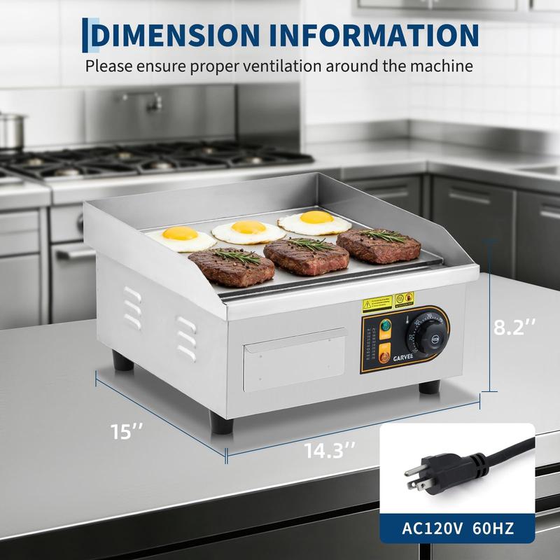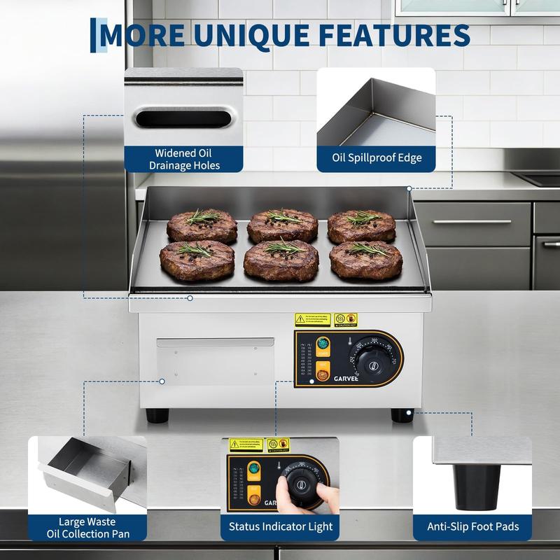 · Versatile Use - Multi-Functional Electric Griddle: Suitable for restaurants, roadside stands, cafes and home kitchens. This commercial flat top grill excels at making pancakes, bacon, steaks, burgers and more, meeting both high-volume commercial demands and family cooking needs.