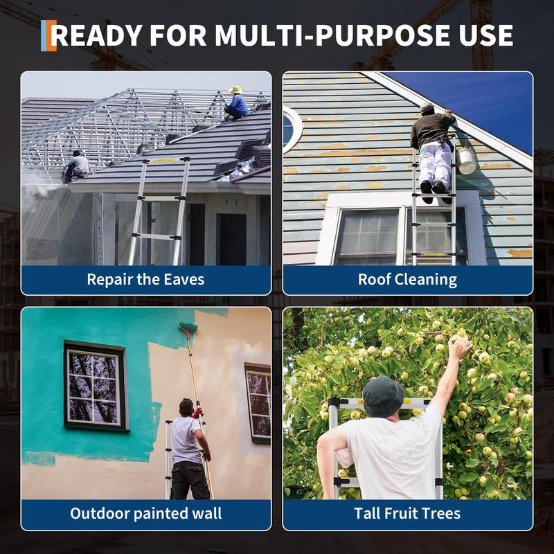 · 【Multi-Scenario Professional Use】Commercial-grade telescoping ladder for roof access, warehouse inventory management, Christmas light installation, window washing (works as leaning/straight ladder), RV maintenance, and tree pruning.