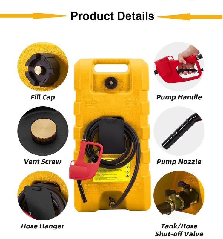 · Fast & Easy Siphoning – Equipped with a stop-and-go pump handle, this fuel container delivers rapid, spill-free transfers at a flow rate of 2 gallons per minute. The siphon system eliminates heavy lifting, making refueling vehicles or equipment quick and effortless
