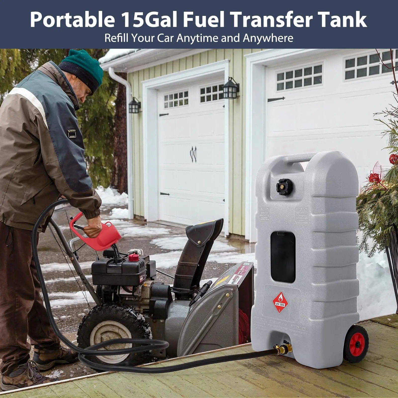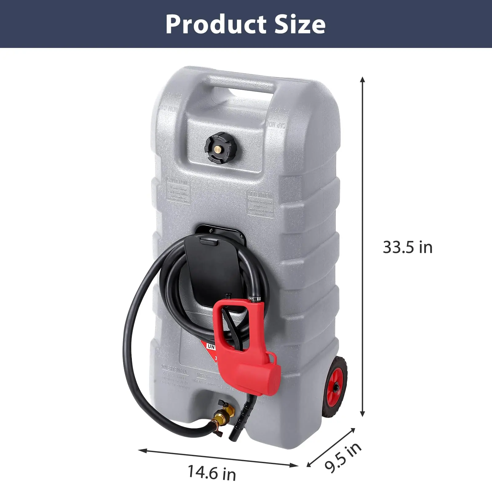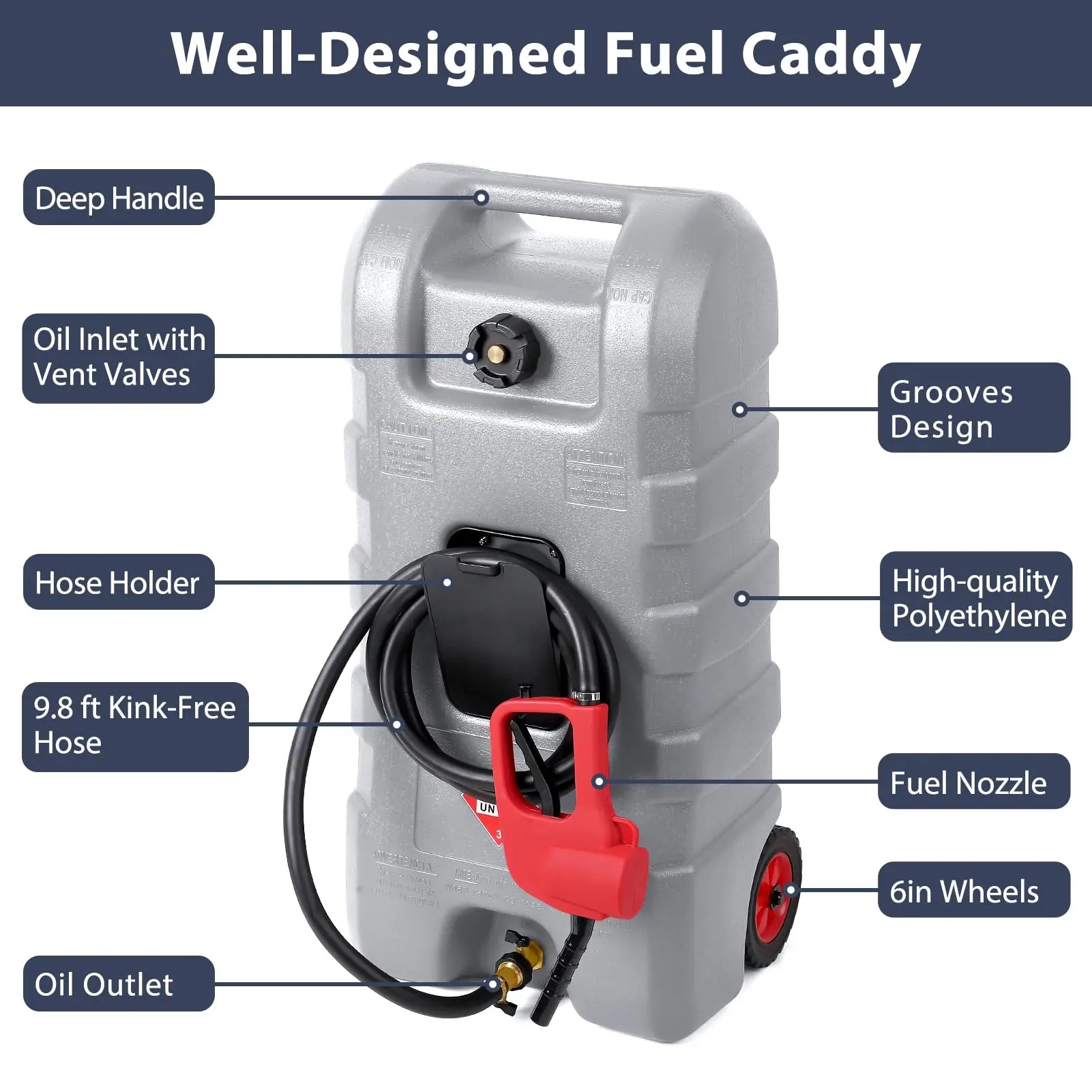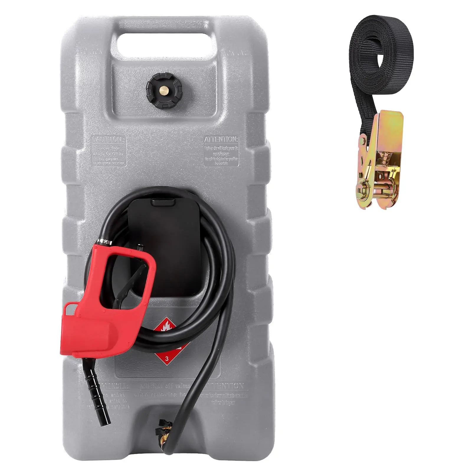 · 【15 Gallon High-Capacity Fuel Tank】 This 15 gallon fuel caddy offers ample capacity for storing gasoline, diesel, or kerosene. Made of durable polyethylene, it's ideal for multiple refuels without constant trips. Comes with a 10FT automotive-grade rubber hose and a storage stand for easy organization.