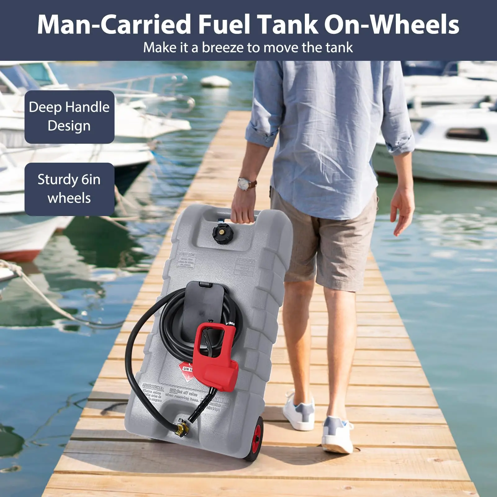 · 【Mobile Design with Wheels & Handle】 Featuring 6-inch rugged wheels and an ergonomic molded handle, this portable fuel tank for boats or garages is easy to move across docks, gravel, or yard terrain—perfect for quick refueling anywhere.