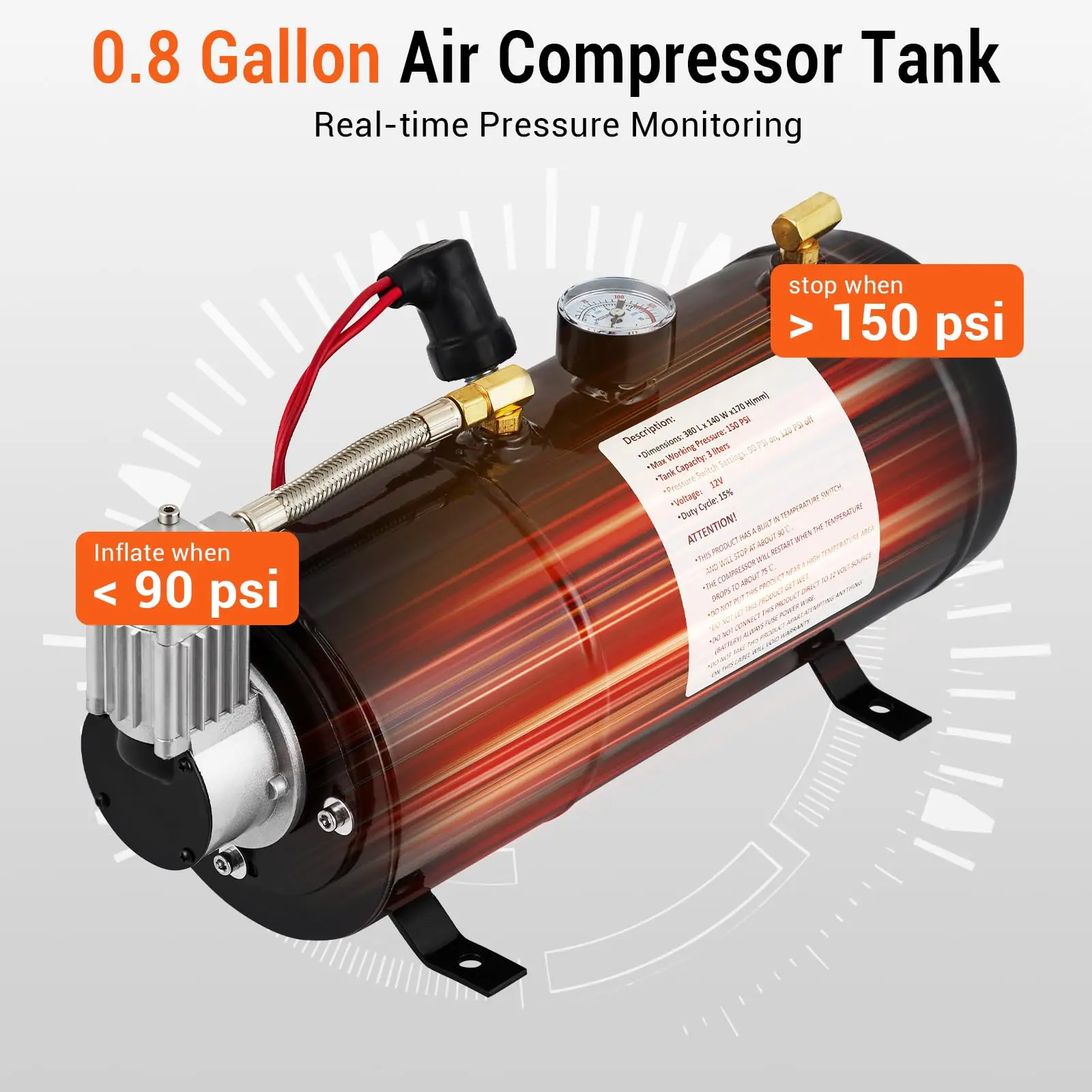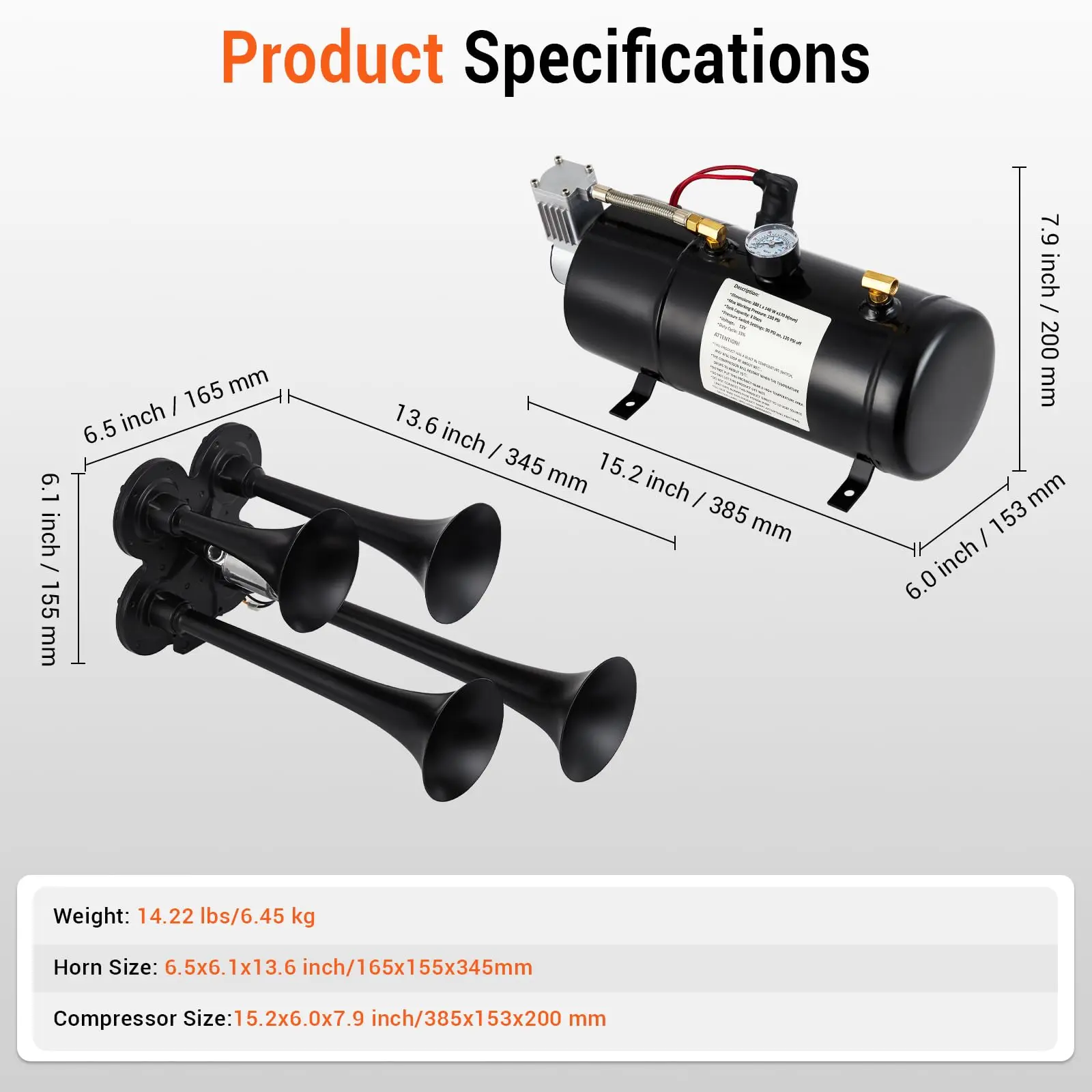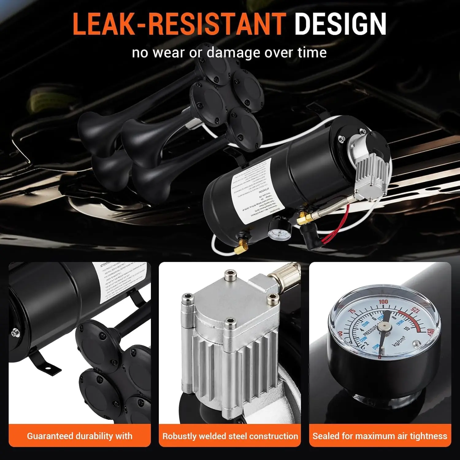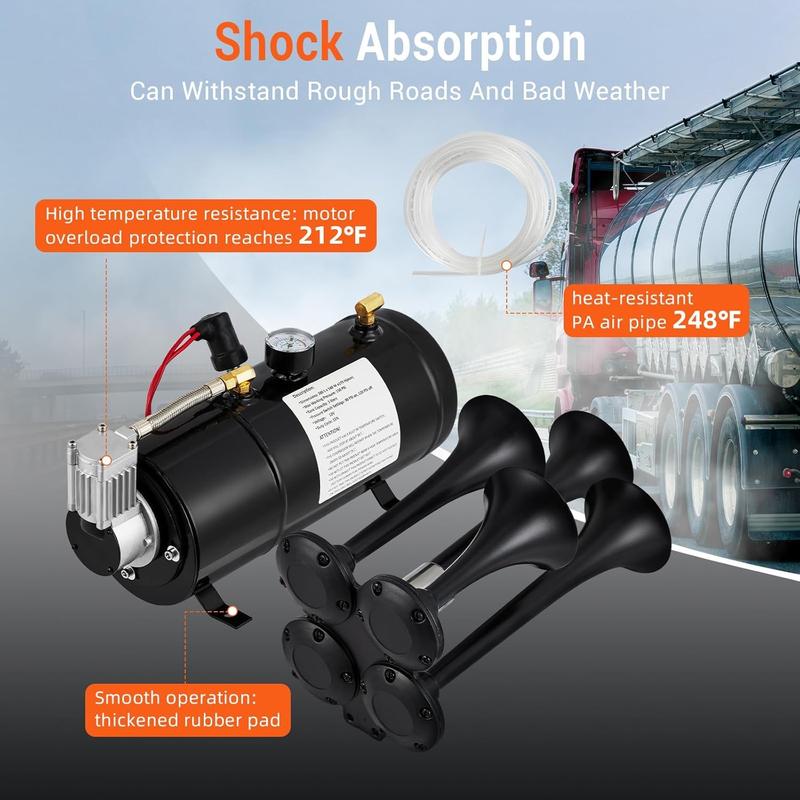 · 150 PSI Compressor: our train horn's powerful 3L (0.8 gallon) compressor! It features an automatic shut-off that kicks in when the pressure hits 150 PSI, ensuring you stay safe on the road. Plus, with four shock-absorbing pads and a 30 amp fuse for added protection.The Electric Train Horn Kit includes 4 trumpet air horns, a solenoid valve, a 0.8 gallon water tank, a 150 PSI compressor and tubing. (Note: Power switch not included).