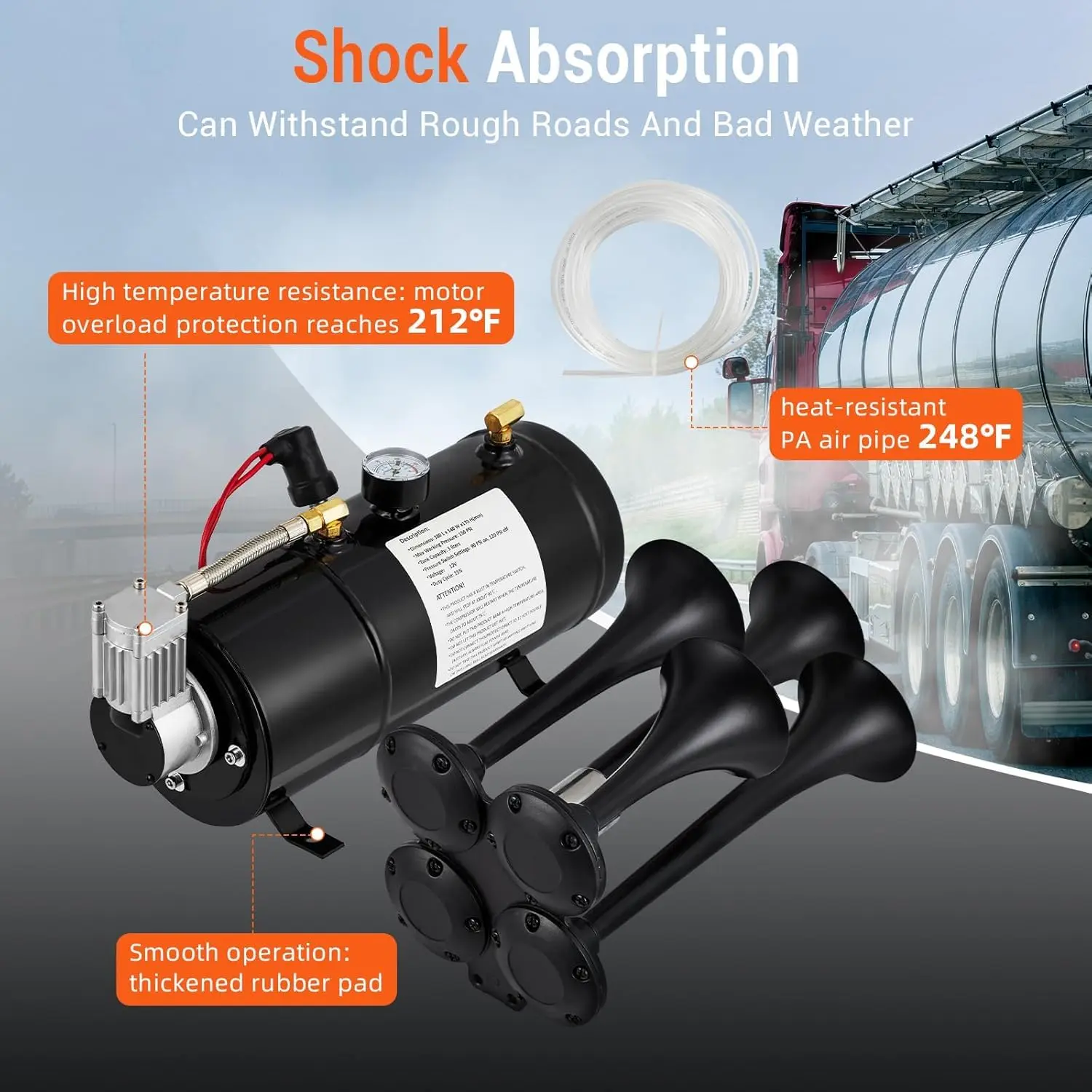 · Equipped air horn switch: Compared with almost all other train horn kits on the market, we are more intimate to equip the user with a separate horn switch, which makes you no longer need to buy it separately. And when the temperature of our air compressor exceeds 90°C(194℉), it will automatically shut down, and when the temperature drops to 75°C(167℉), it will restart.