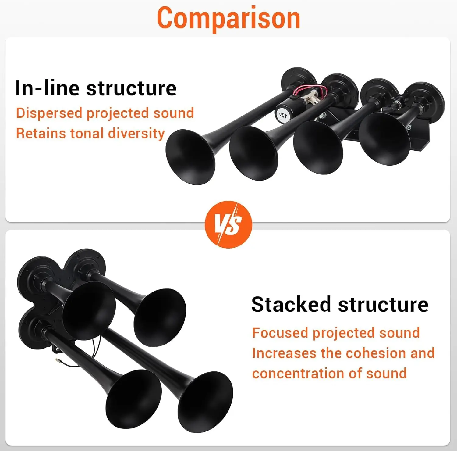 · Widely Use: The Air Horns is great for any truck or van owners who want to bring the noise in a way that stands out in both sounds and looks. It is suitable for all 12V vehicles such as cars, boats, trucks, tractors, vans and etc. And it is also extremely suitable for motorcycles or boats.