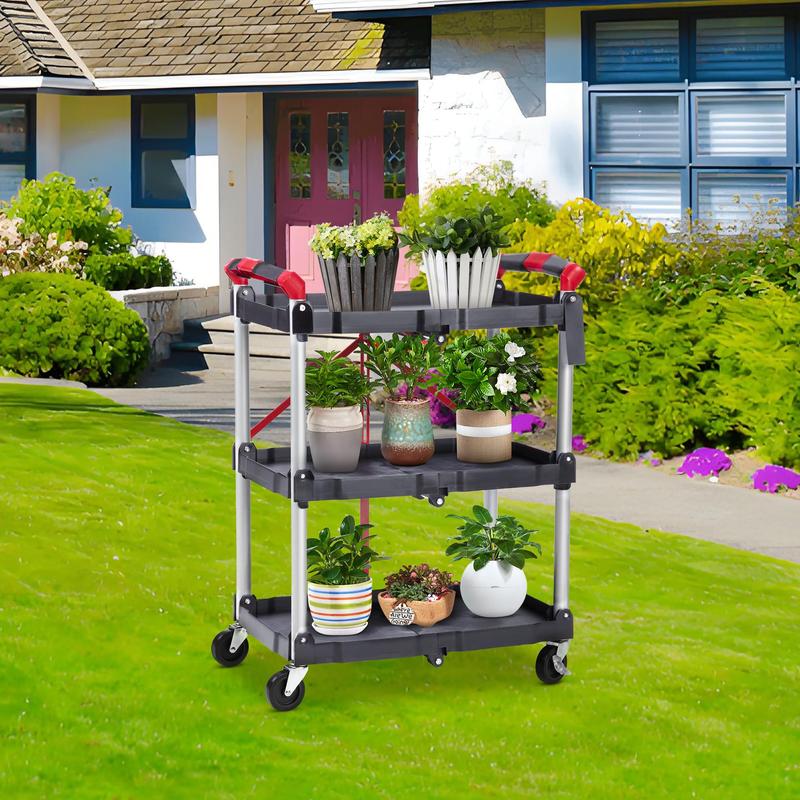 · Ergonomic Grip + Easy-Clean Design.Anti-slip ergonomic handle reduces hand strain during heavy loads. Industrial PP shelves wipe clean with a damp cloth; aluminum legs resist rust and stains. Rounded corners protect walls and furniture—safe for homes, schools, or crowded offices