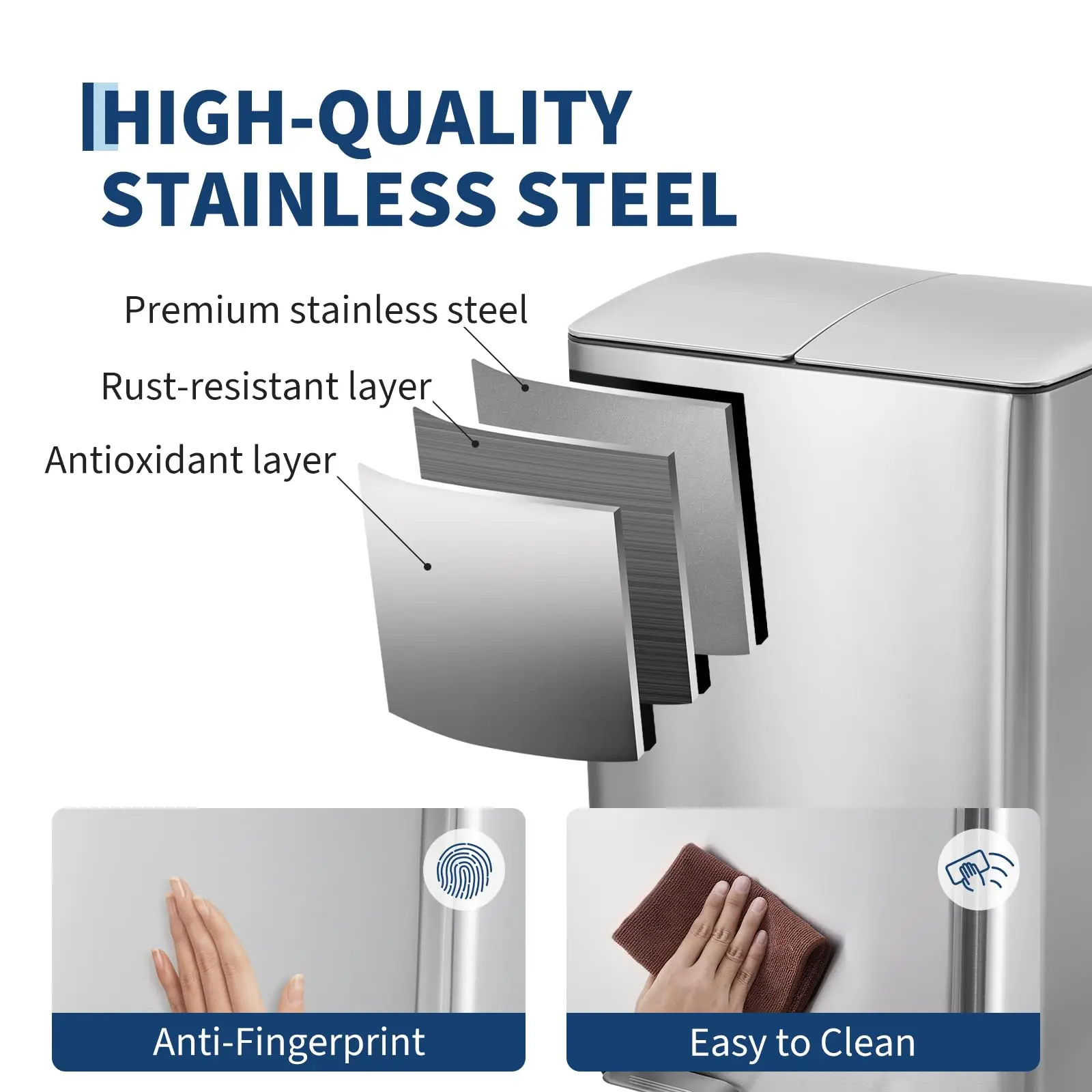 · Premium Stainless Steel & Easy Clean: Crafted from rust-resistant and antioxidant stainless steel with a brushed finish. The smudge-proof and anti-fingerprint surface ensures this kitchen trash can stays flawless with just a quick wipe, maintaining a sleek look in your home and kitchen.