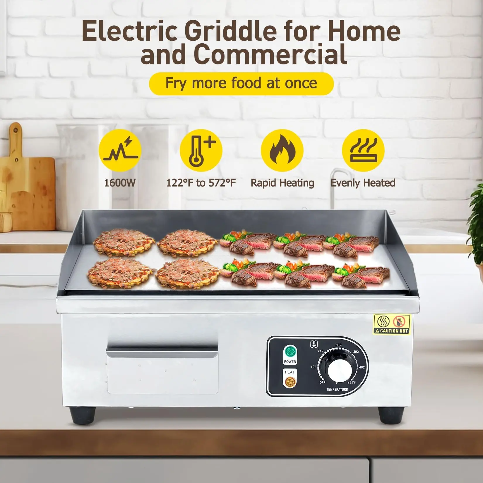 · Commercial-Grade for High-Volume CookingBuilt for restaurants, diners, food trucks, and home kitchens needing heavy-use performance. Grill burgers, bacon, Philly cheesesteaks, hibachi, pancakes, or stir-fry—all on one industrial-strength surface. (Note: 1600W suits commercial outlets; check home voltage compatibility.)