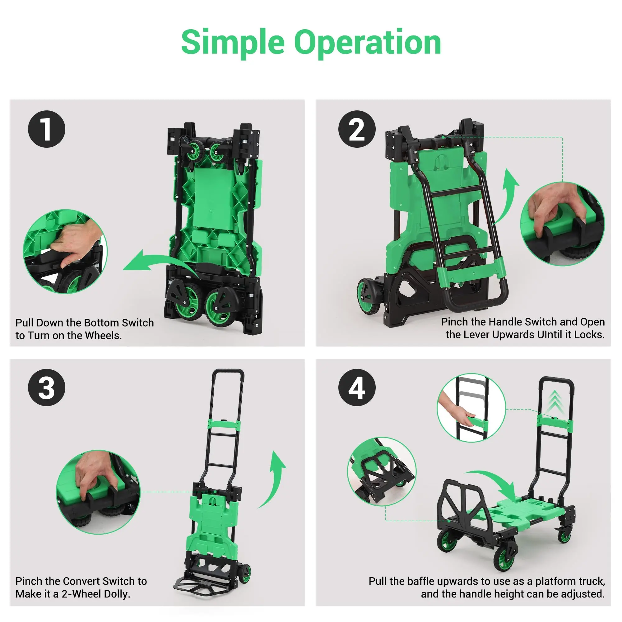 · 2-IN-1 CONVERTIBLE DESIGN – Switch from a 2-wheel upright dolly to a 4-wheel flatbed cart in seconds. No pins, tools, or assembly required, so you can tackle boxes, appliances, or oversized items without missing a beat.