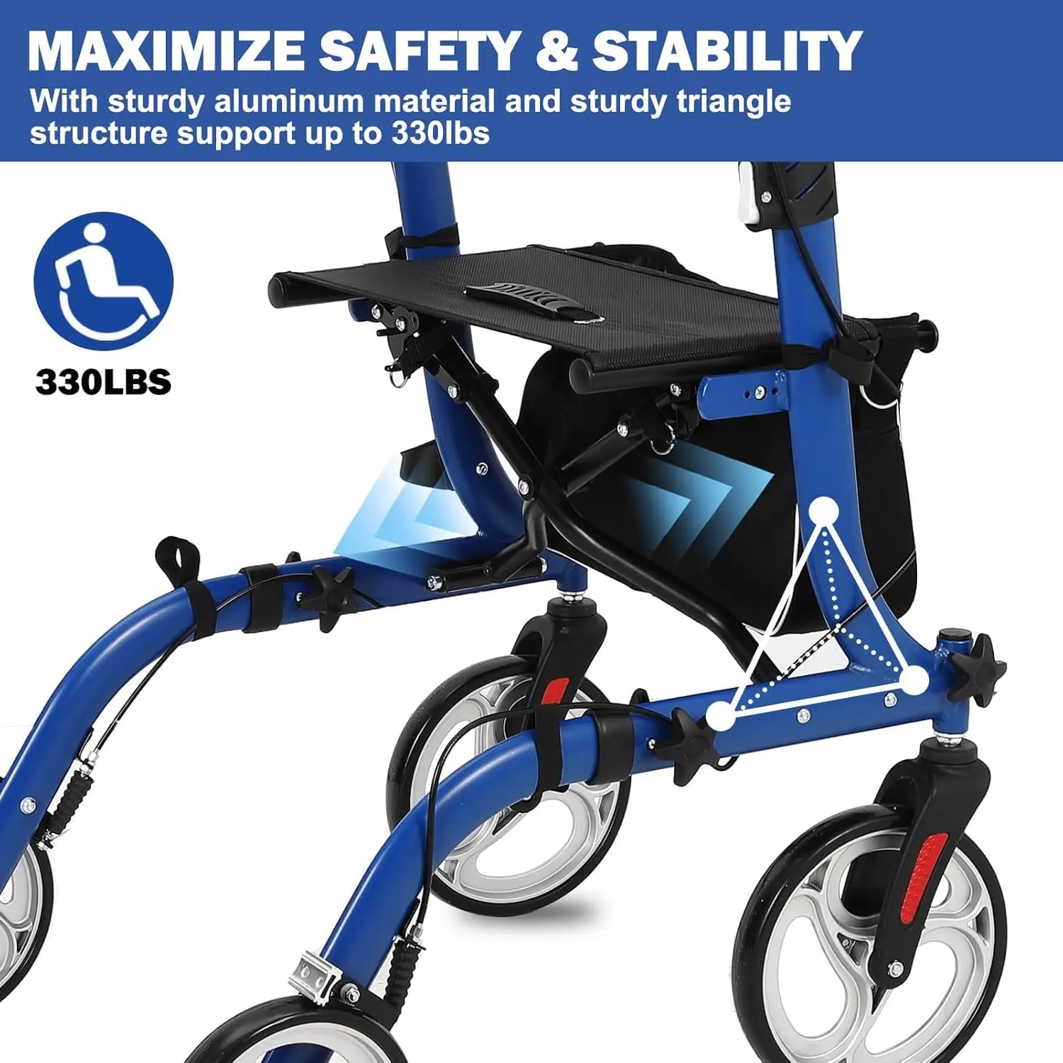 · Perfect Outdoor Rollator Walkers:10” solid polyurethane flat-free tire, explosion-proof tires, non-slip, wear-resistant, with good shock absorption, easy to maneuver on grass, gravel, dirt, and gaps in sidewalks.