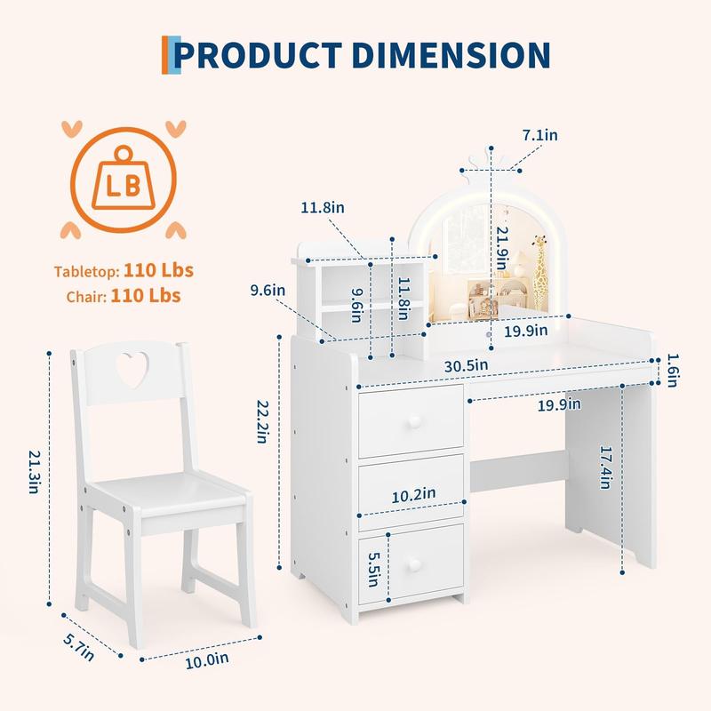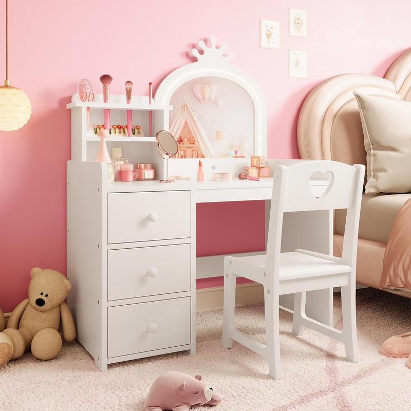 · Safe & Sturdy Construction: Crafted from premium MDF materials, this wooden vanity table and chair set is designed for durability and child safety. Smooth surfaces and rounded edges help protect little ones from accidental bumps—perfect for everyday use