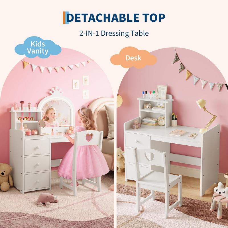 · 2 in-1 Convertible Design: The detachable vanity top lets this kids vanity set transform easily into a writing desk. Perfect for crafts, homework, or creative projects, it grows with your toddler, offering lasting value in any girls' bedroom or playroom