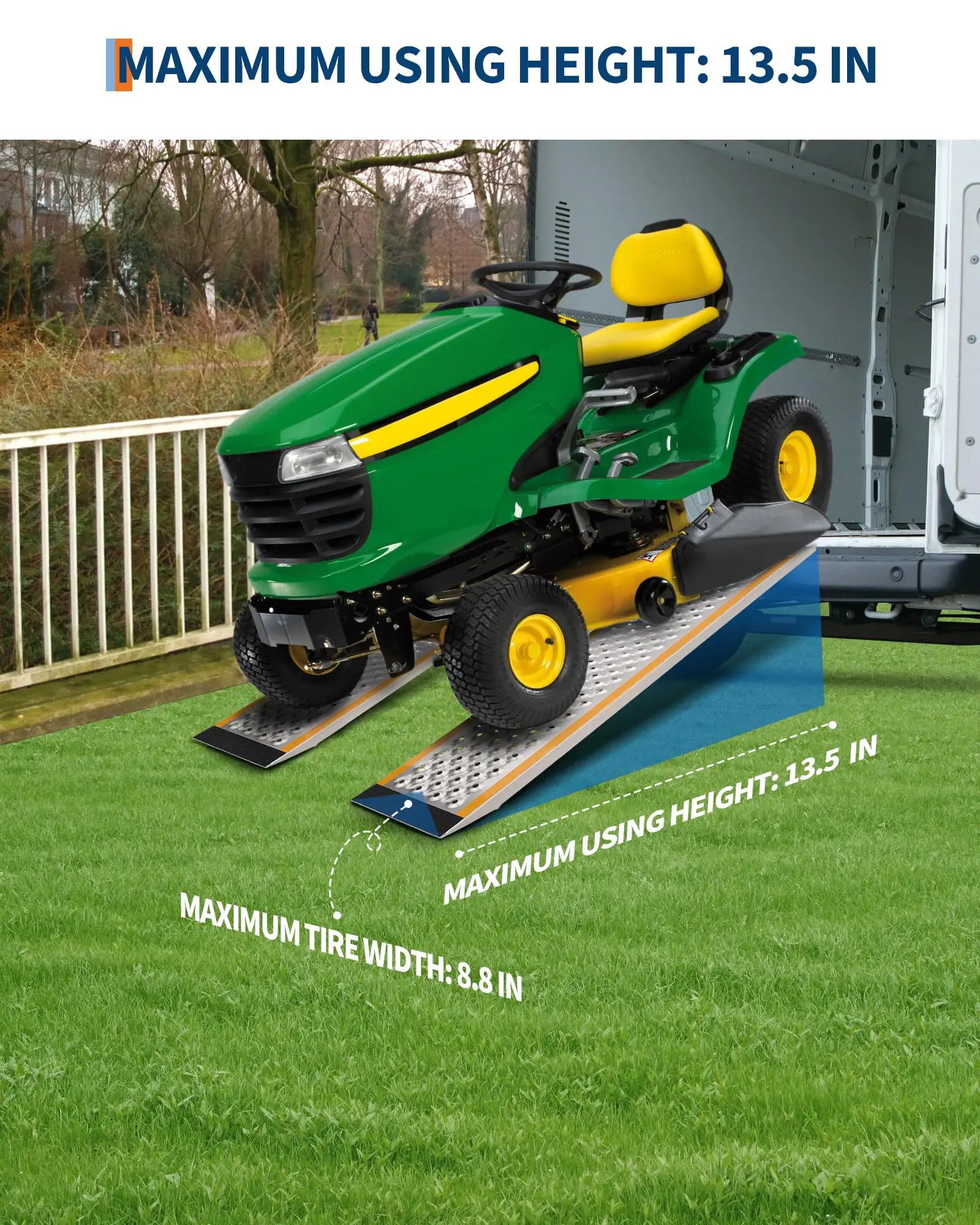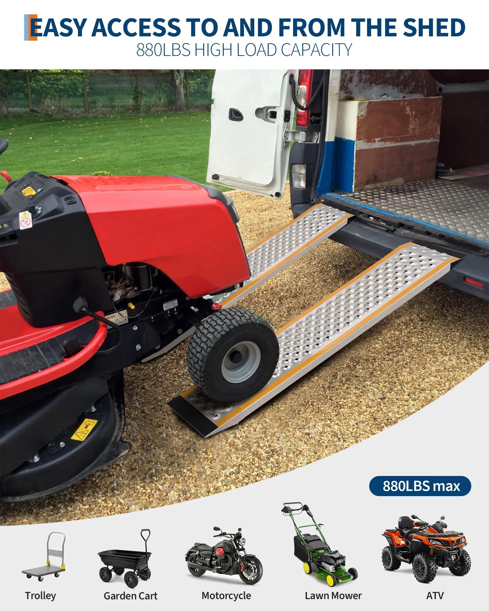 · Ideal Size & High Capacity: Set of two ramps (47"L x 9"W, max 13.5" height). The loading ramp set supports up to 880 lbs, perfect for safely moving two or four-wheeled vehicles into most sheds.