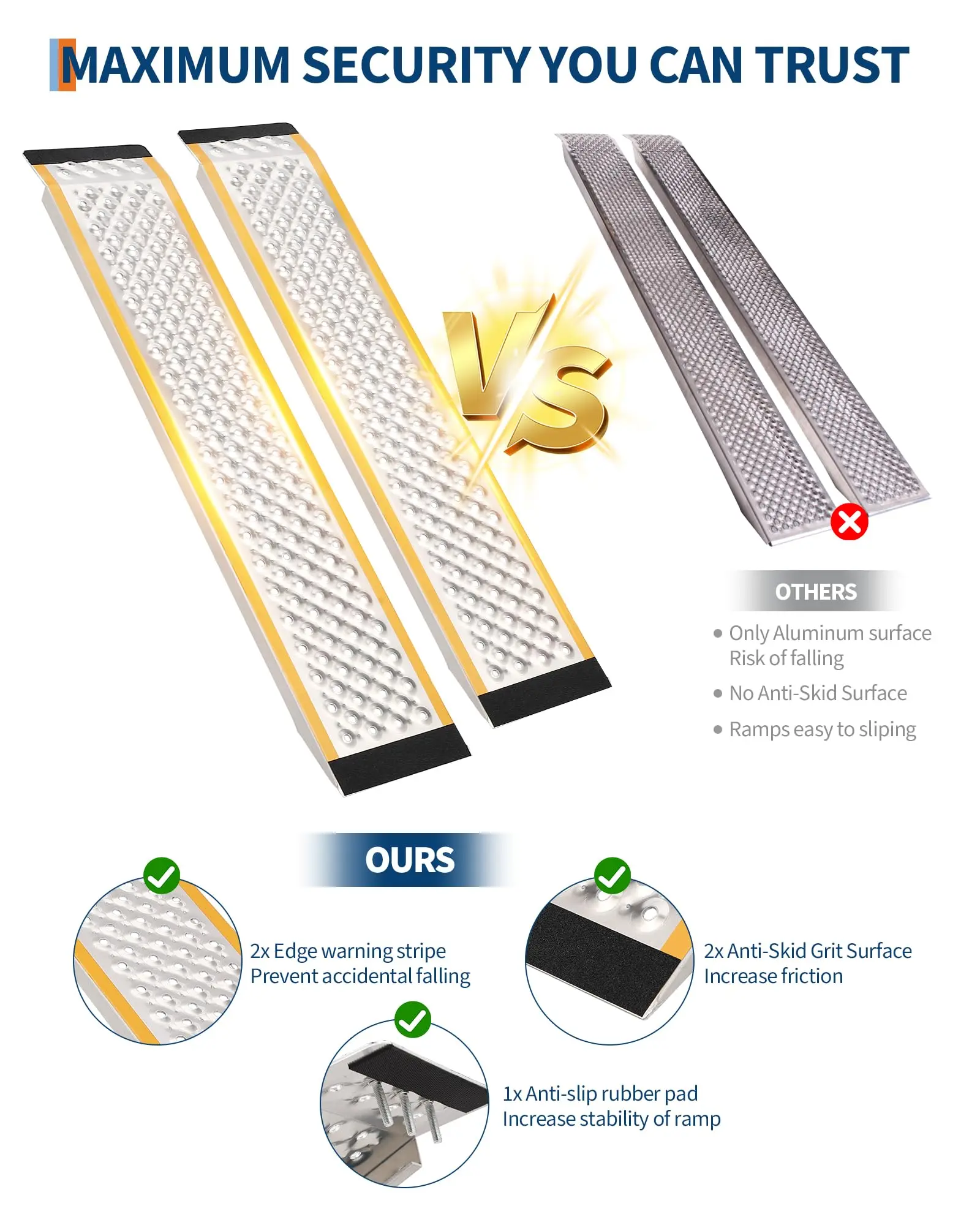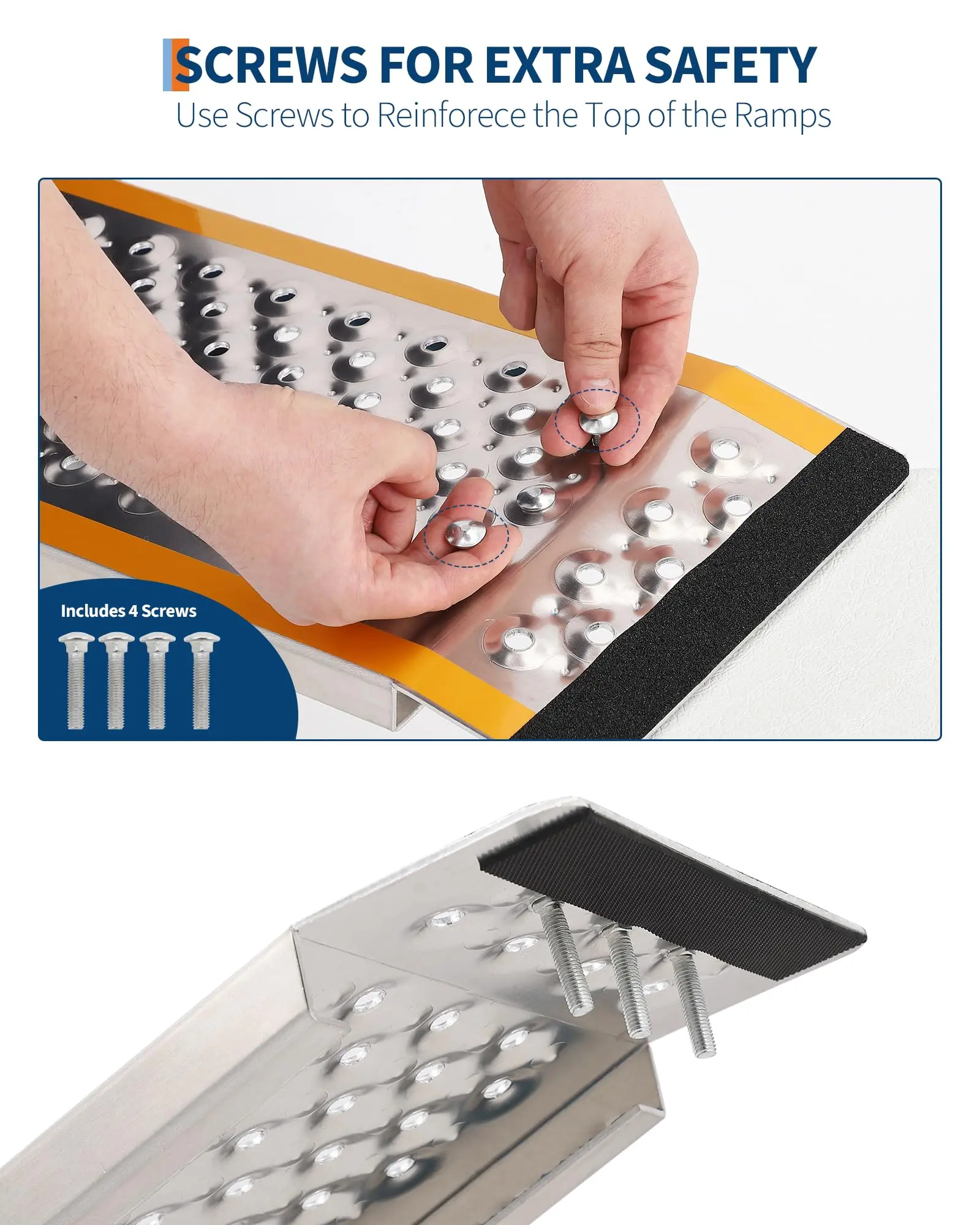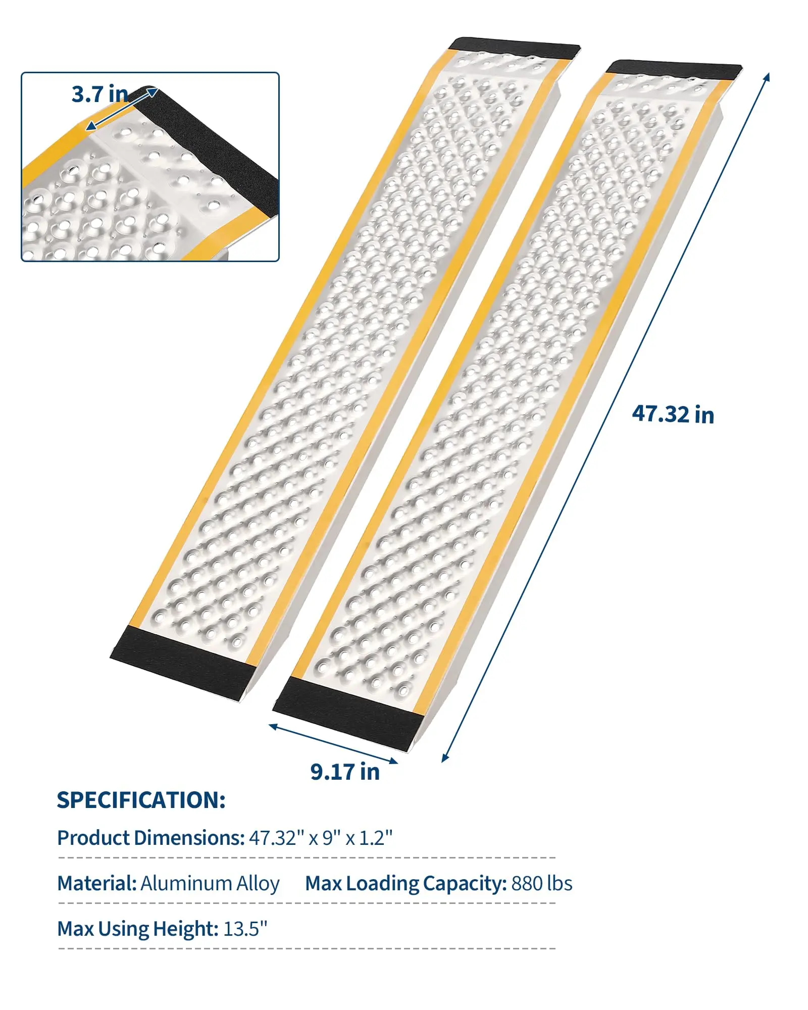 · Enhanced Night Visibility & Safety: Bright yellow edge tape ensures clear sight of the ramp in low light or darkness. Top/bottom anti-slip pads protect your vehicle and keep the ramp securely in place.