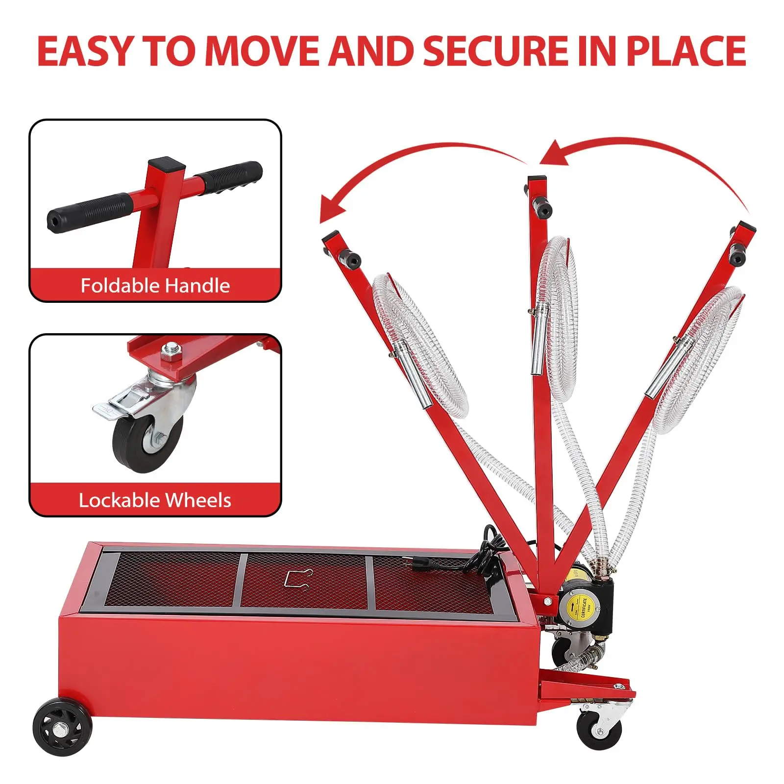 · EASY TO MOVE: Our oil drain pan features two fixed and two free wheels for easy movement and positioning, and swivel casters with brakes for safe parking. The collapsible T-handle is ideal for low profile applications and is easy to store, move and pull.