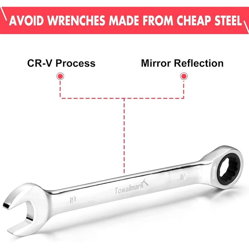 Our GARVEE 20-Piece Ratcheting Combination Wrench Set is crafted with precision and care, ensuring durability and efficiency that lasts. The polished chrome finish not only adds a professional look but also provides corrosion resistance for longevity.