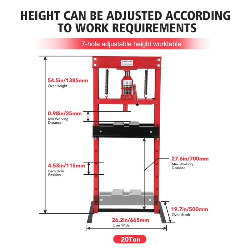 · Powerful 20-Ton Capacity: Featuring a strong 20-ton bottle jack, this hydraulic press simplifies metalworking tasks such as bending, straightening, and stamping. Its consistent performance makes it an essential tool for a variety of metal fabrication projects.
