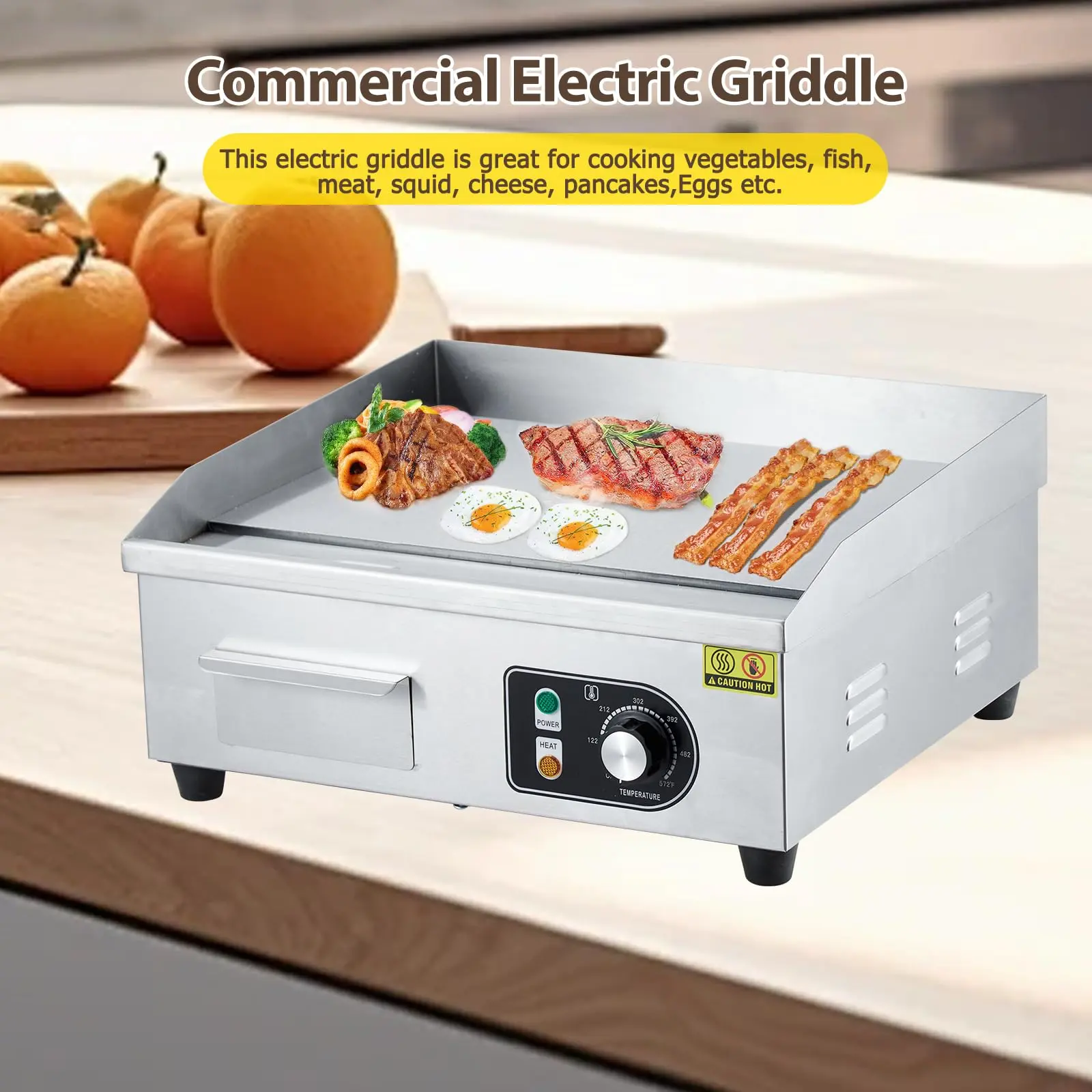 · 1600W Powerful Commercial Griddle: This electric griddle designed with additional splash guards and multiple ventilation holes, this 1600W Commercial Electric Grill protects users from hot grease and ensures proper heat dissipation. This practical design keeps the surrounding area clean and maintains a safe cooking environment.