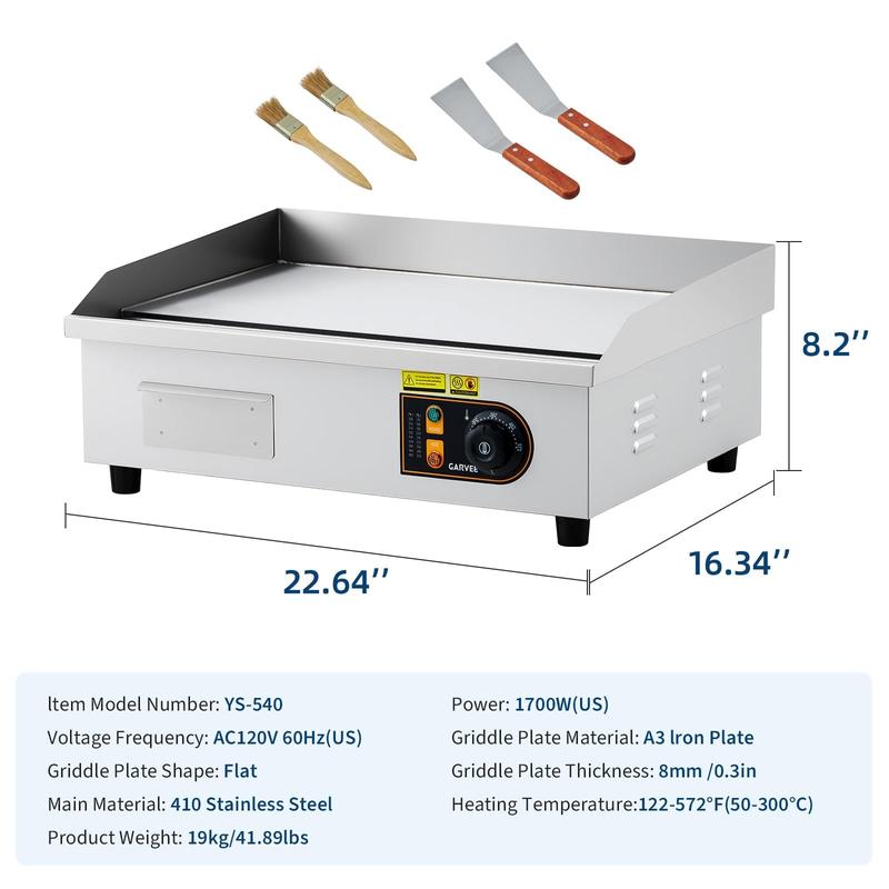 · Precise Temp Control (122-572°F/50-300°C) - Adjustable Electric Griddle: Wide temp range of this commercial grade electric griddle covers all cooking needs—50°C for heat preservation, 180°C for grilled cheese, 300°C for searing steaks. Adjustable settings enable customized heat for different recipes, ensuring professional results.