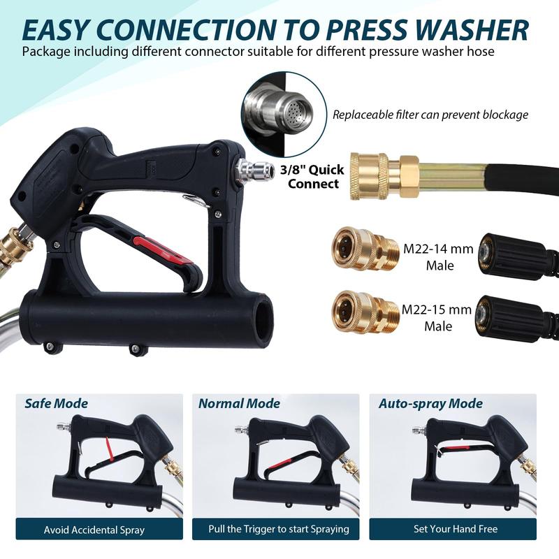 · Good Compatibility: Compatible with most gas and electric pressure washers rated 2,000-4,000 PSI. The spray gun has a 3/8'' QC inlet and 2 hose adapters, which fit most power washer hoses. Equipped with a high-pressure hose for cold and hot water. Note: The surface cleaner must be used with a pressure cleaning machine, and is not suitable for garden hoses or water hoses