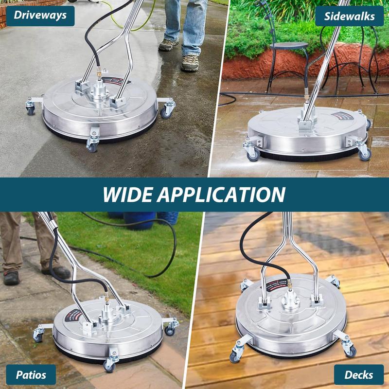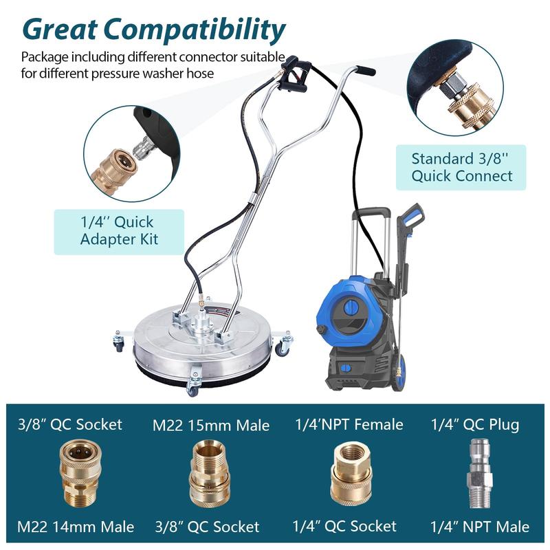 · Premium Quality & Accessory: Our surface washers are made of robust stainless steel with a waterproof and non-deformable design, ensuring convenient use for years. Package Content: Surface cleaner, 2 replacement nozzles, 3/8'' QC to M22-14 male fitting, 3/8'' QC to M22-15 male fitting, 1/4" NPT Male QC Plug, 1/4" NPT Female QC Socket, High-pressure Hose, Cleaning Needle, Wrench, Teflon tape, O-rings