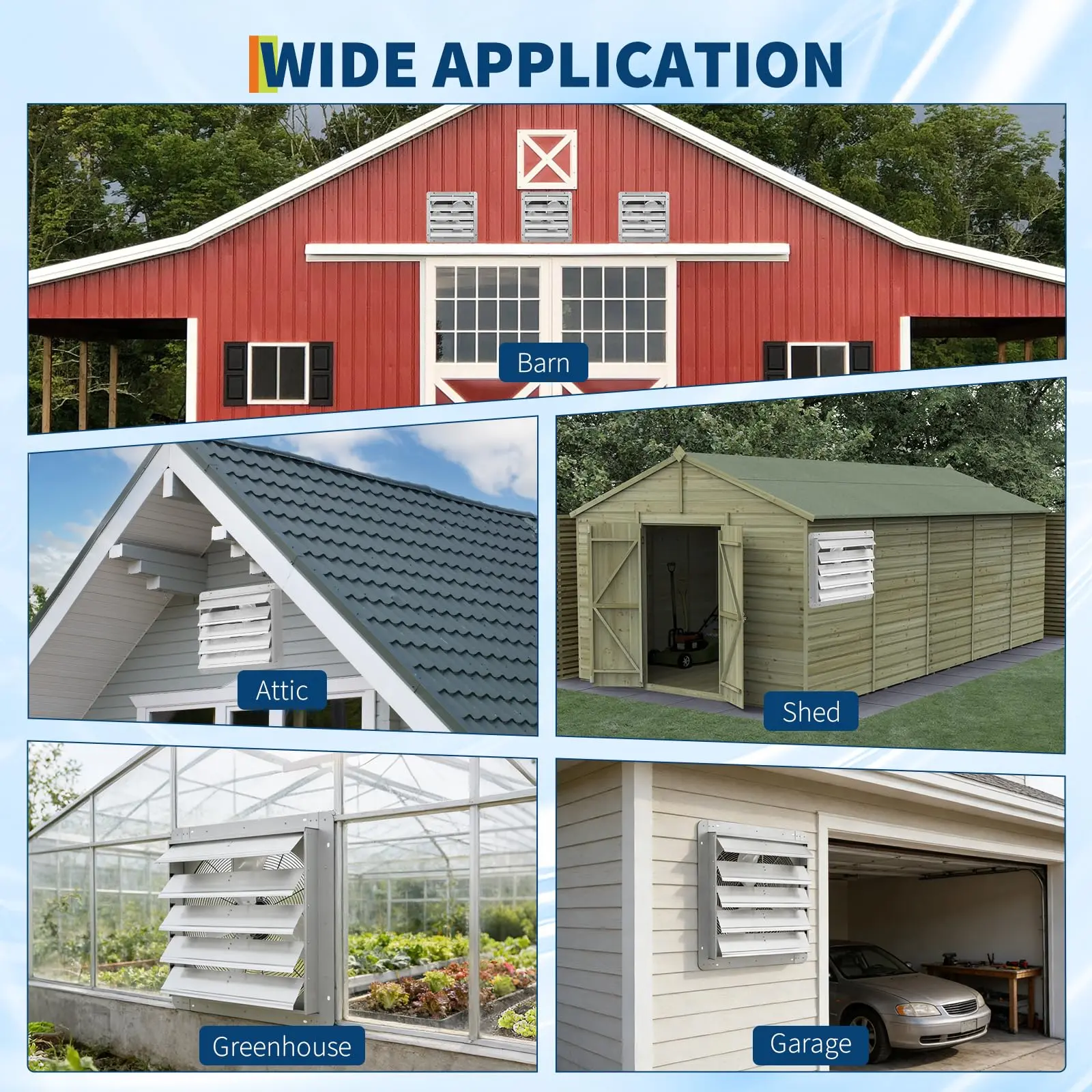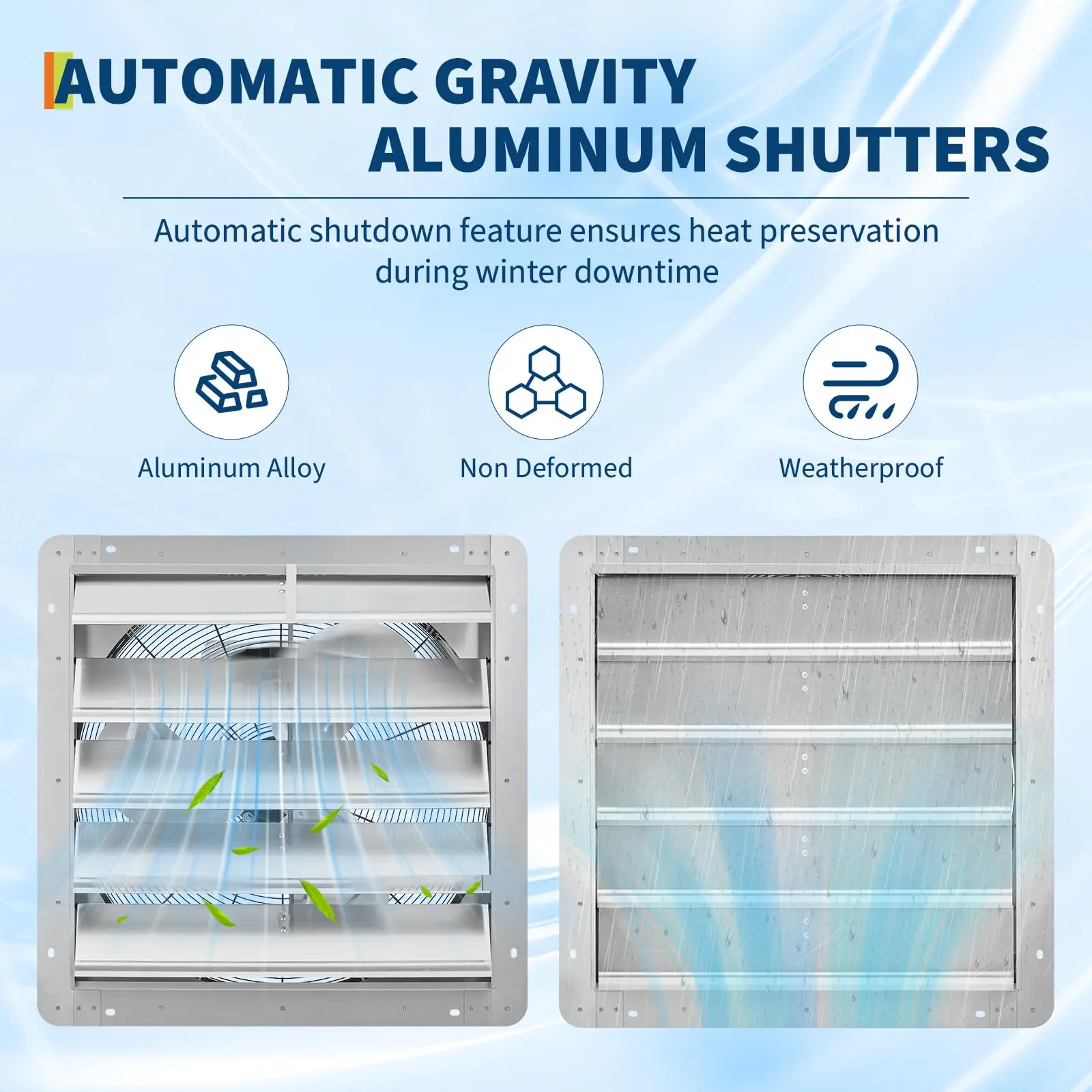 · Automatic Aluminum Shutters: Automatic aluminum shutters open and close with the fan, preventing backdrafts and blocking dust, rain, and insects. Reliable as a garage exhaust fan, attic exhaust fan, or greenhouse exhaust fan in all weather conditions