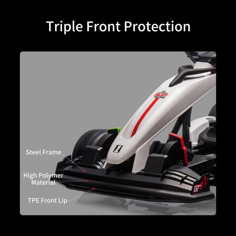 · 【 Drifting Experience】24V 300W motor delivers 8.5MPH racing speed with precision-controlled drifting function. Four EVA silent wheels ensure smooth outdoor adventures while PP foam tires eliminate flat tires - perfect for backyard racing & driveway adventures.