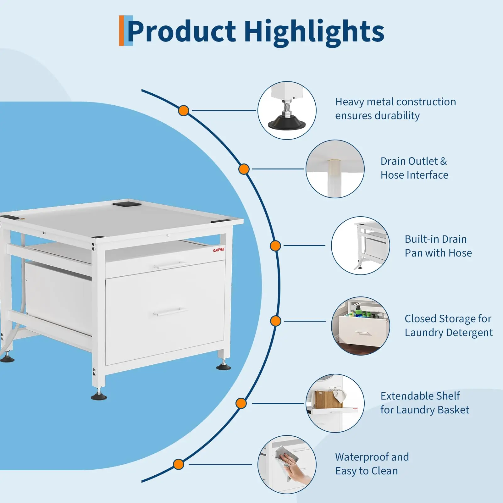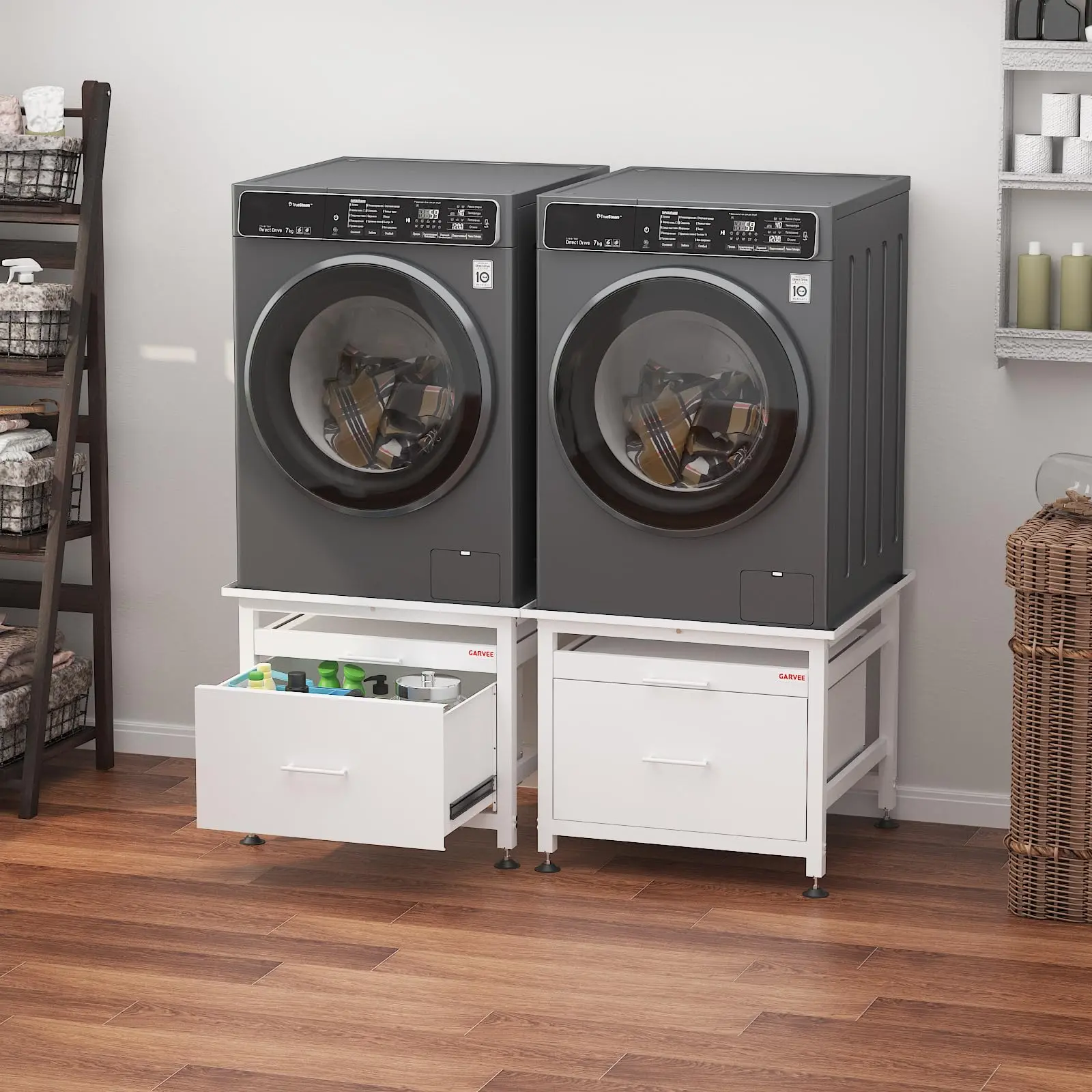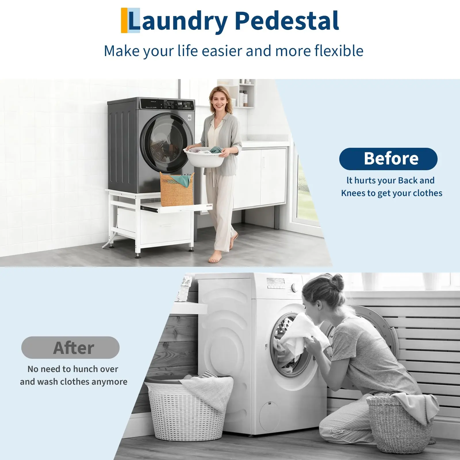 · Expanded Storage Design: The laundry pedestal features built-in Pullout-Shelf,and drawers for additional storage of laundry supplies. This washer pedestal with drawer design keeps items organized while saving space. Equipped with stainless steel slides, the drawer-style washer base offers quiet operation for effortless access, creating a peaceful laundry environment while providing extra space for laundry baskets and other essentials.