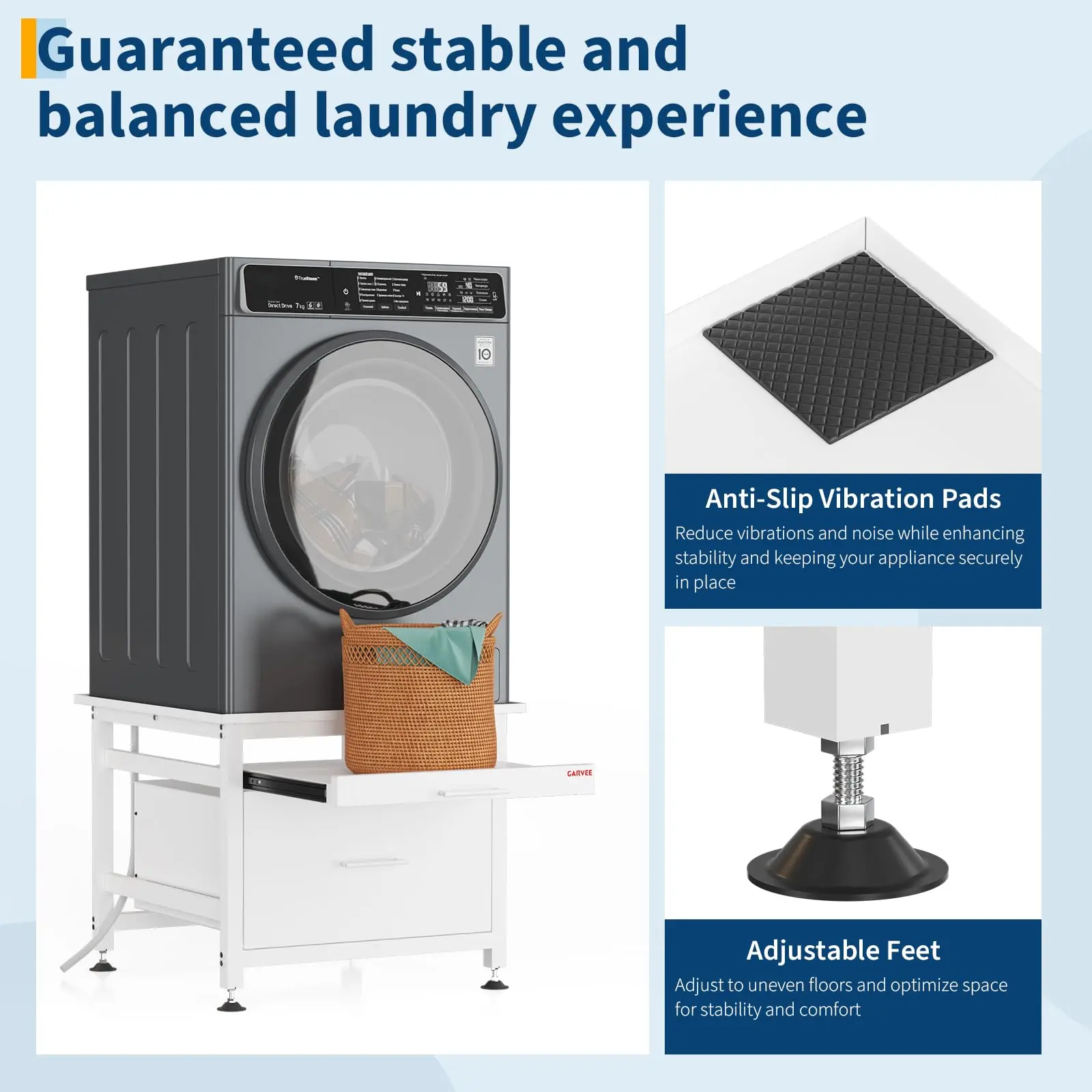 · Quiet Design: This universal laundry pedestal features four anti-slip shock-absorbing pads that effectively reduce noise and vibration while securing the washing machine to prevent slipping and enhance overall stability. Additionally, the washer stand is equipped with four adjustable feet at the bottom, allowing you to easily adjust the height to accommodate uneven surfaces.