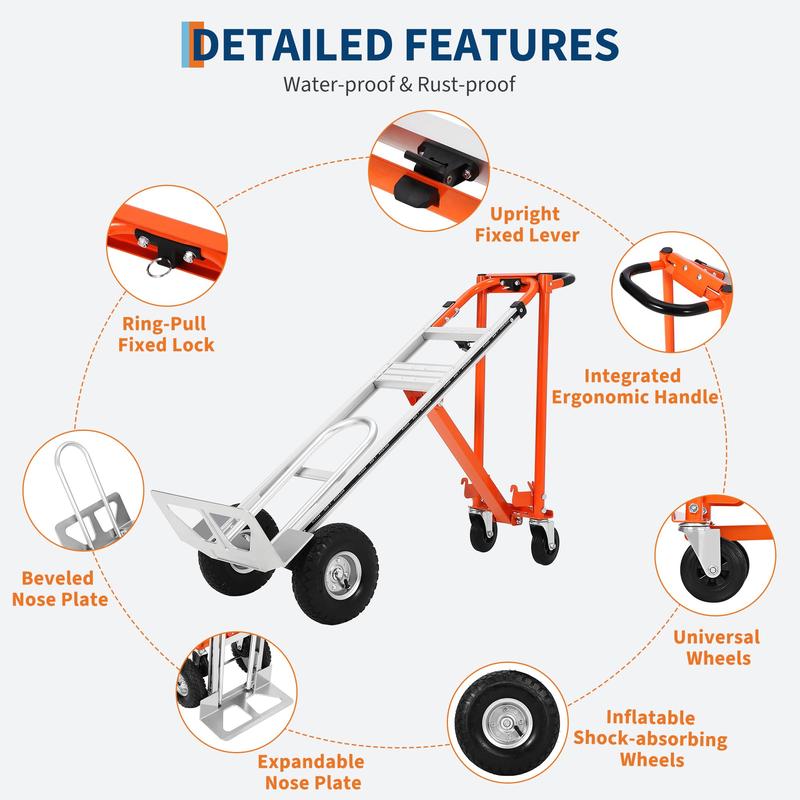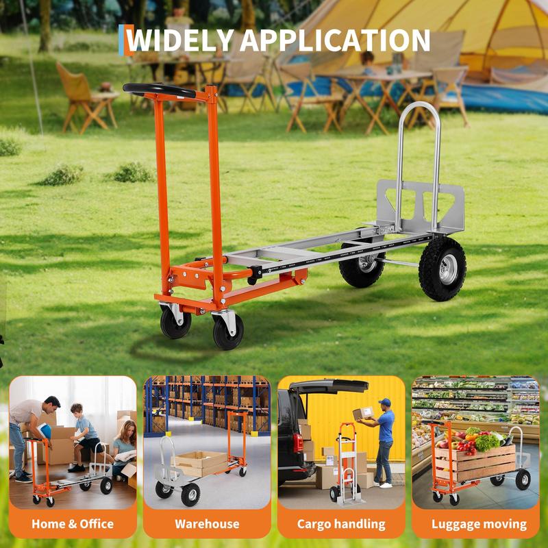· 3-in-1 Versatile Hand Truck: Effortlessly switch between three modes—upright for maneuverability, tilted for reduced strain, and flatbed for max capacity—with no tools needed. Perfect for moving appliances, furniture, or boxes in homes, warehouses, and job sites.