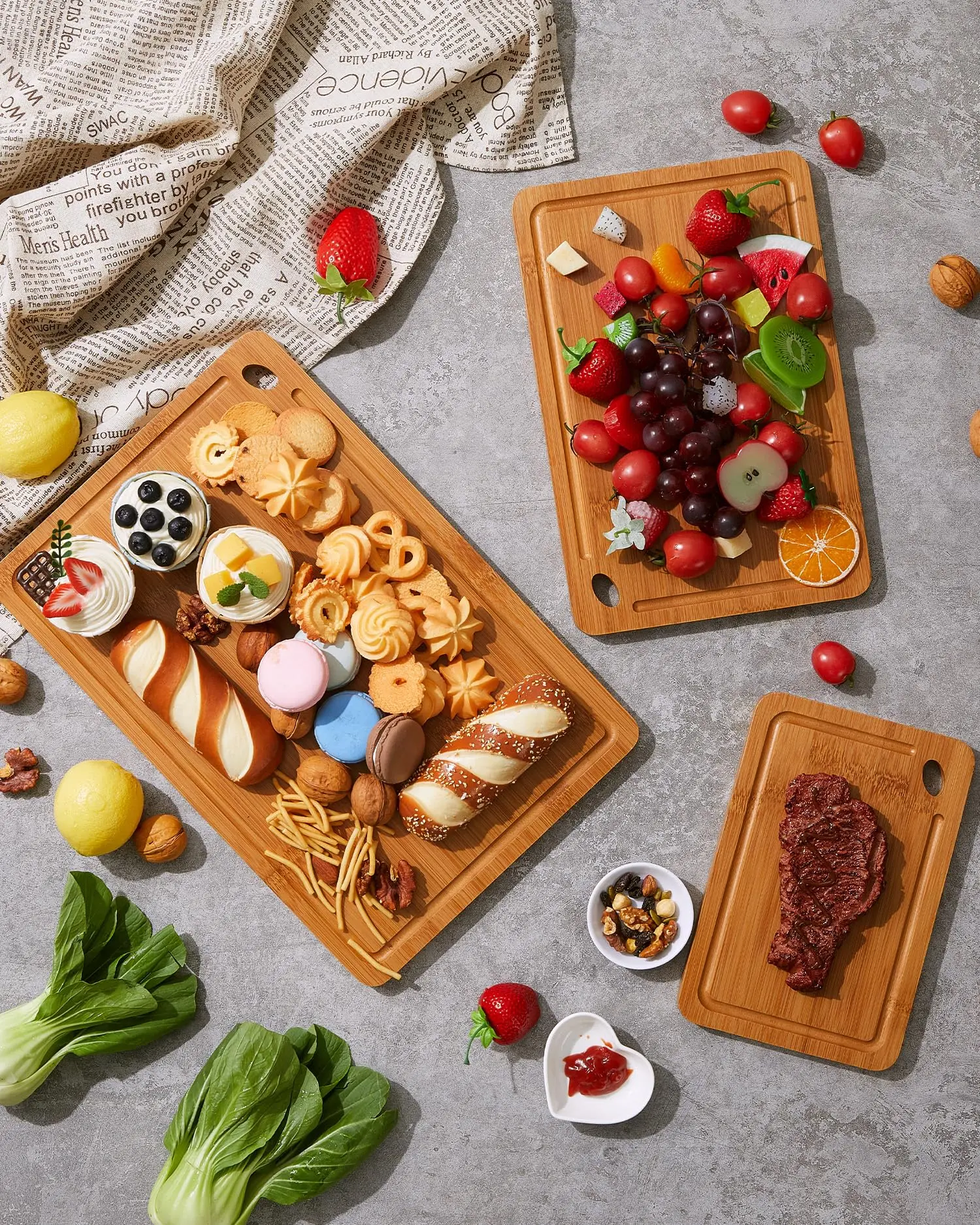 · Natural & Eco-Friendly Bamboo Material:Crafted from 100% natural organic bamboo, these wood cutting boards are an essential kitchen essential. They are highly durable, food-safe, and more resilient than many plastic boards, making them ideal for all your food prep needs. This eco-friendly cutting board set is perfect for slicing meats, vegetables, fruits, cheeses, and bread, or even doubling as a stylish serving tray for your home and kitchen.