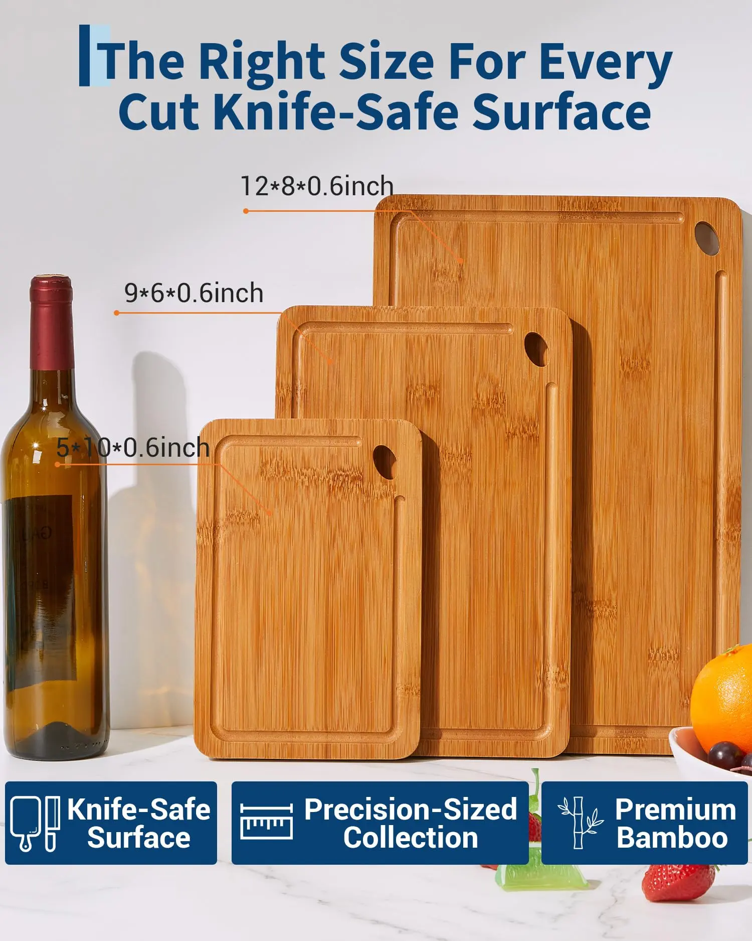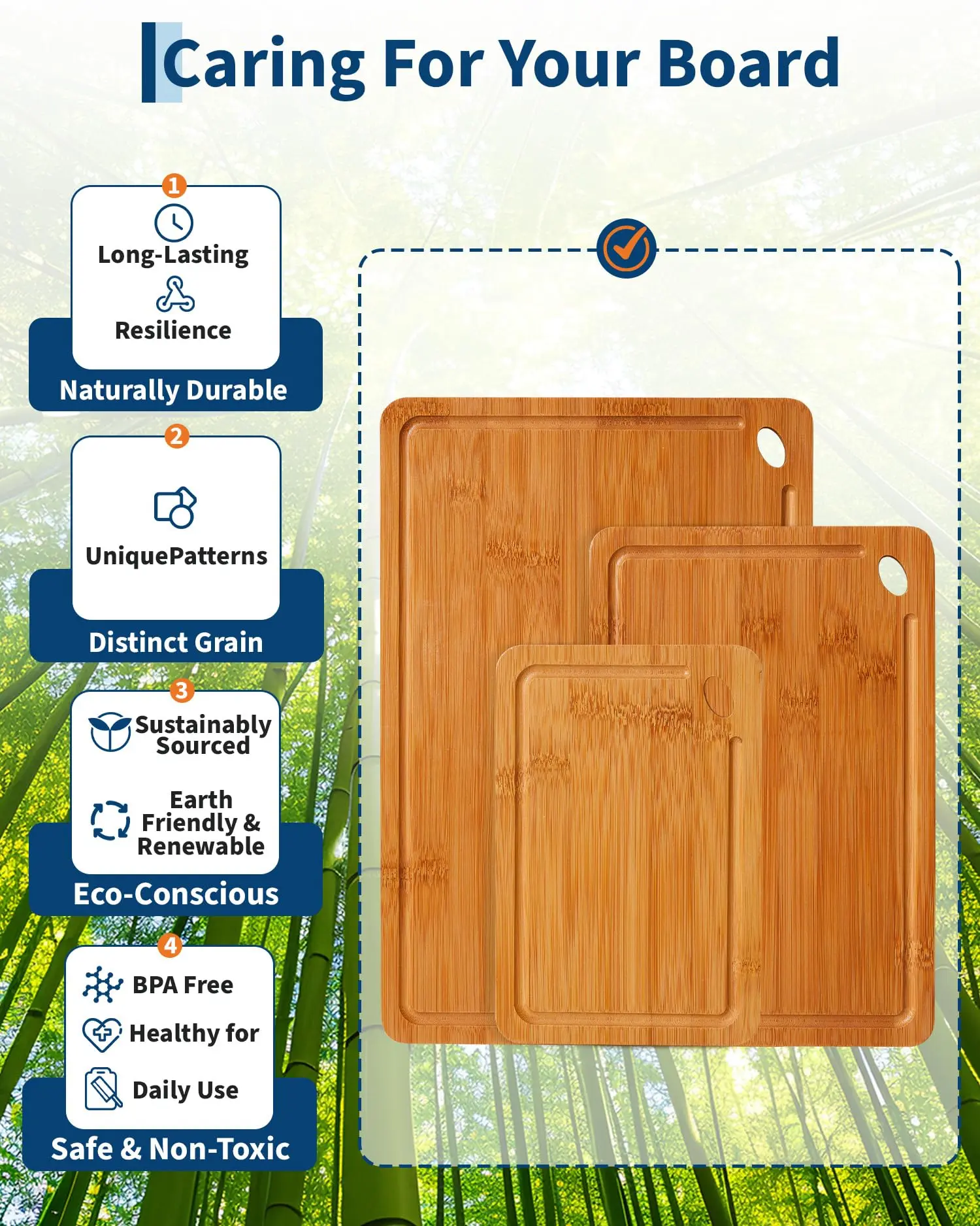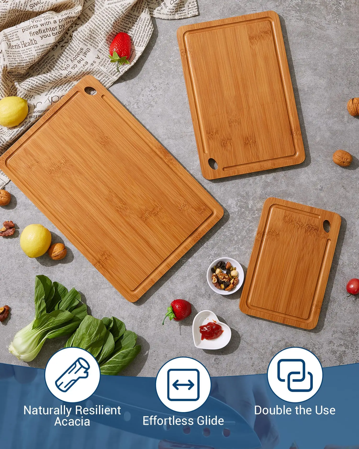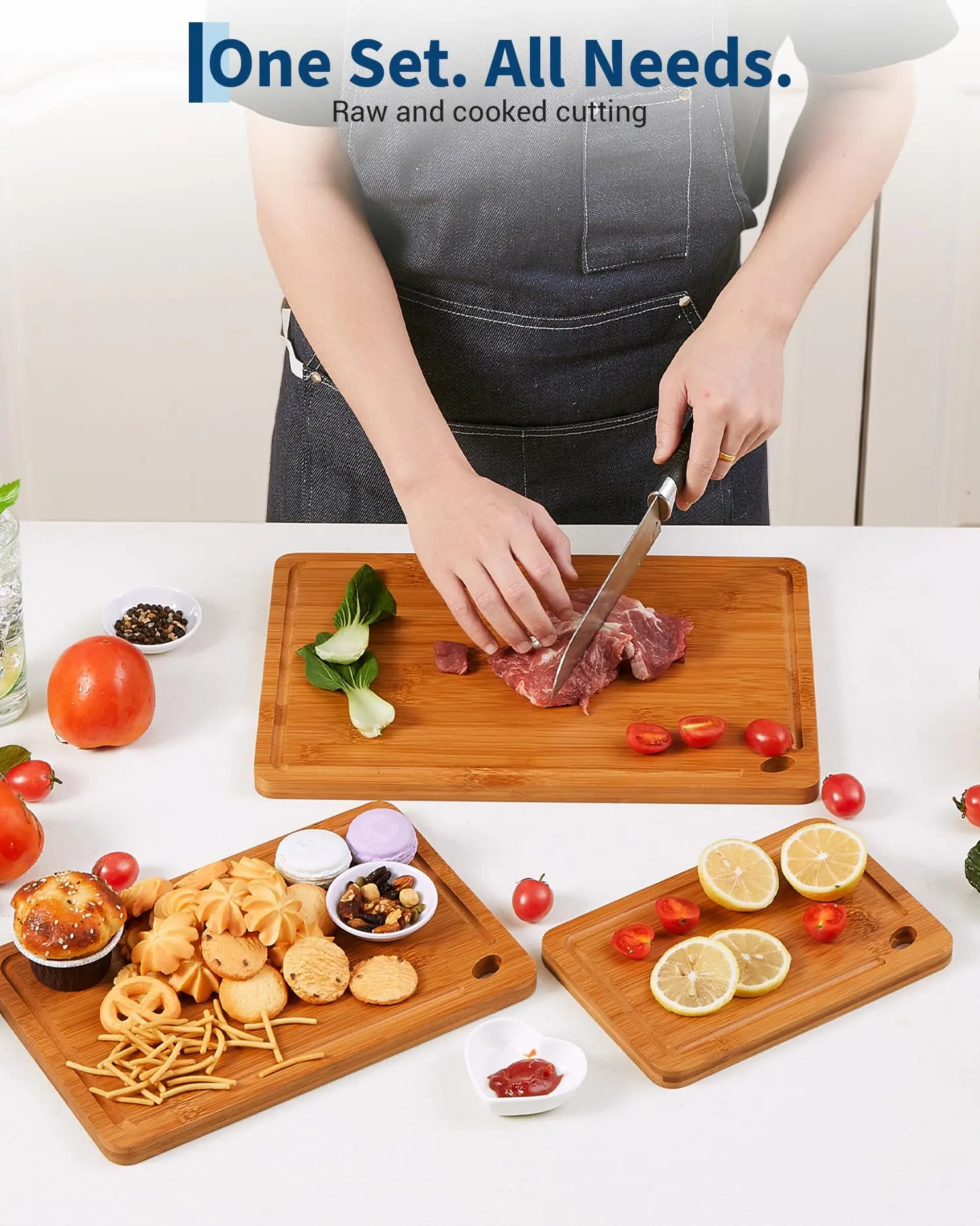 · Easy Storage with Hanging Hole:Beyond its primary function, this bamboo cutting board set is designed for convenience. The compact branding and integrated hanging hole allow for easy, space-efficient storage. As a heavy-duty and easy-to-clean set, these cutting boards for kitchen are built to last, making them a perfect gift and a fundamental home and kitchen essential.