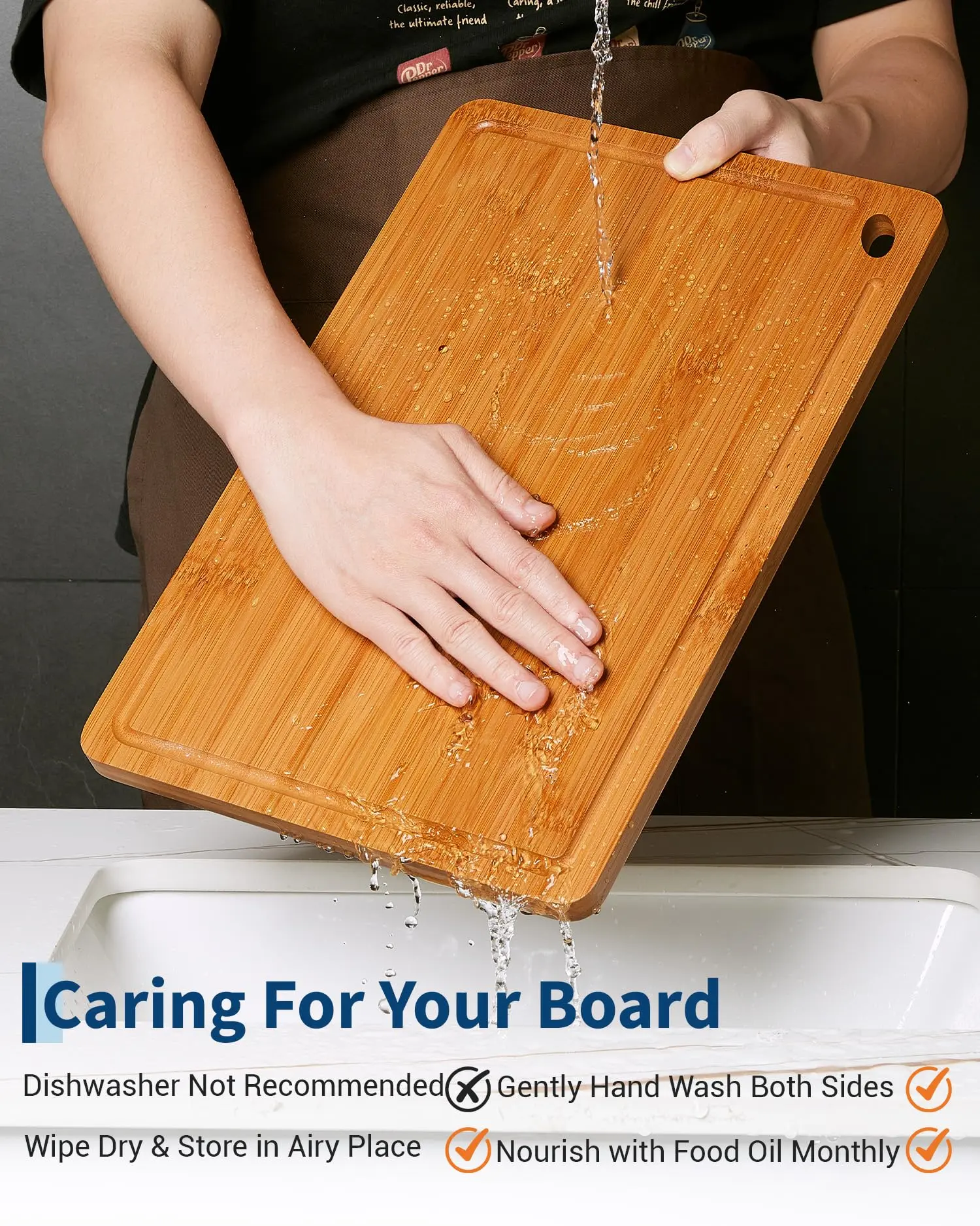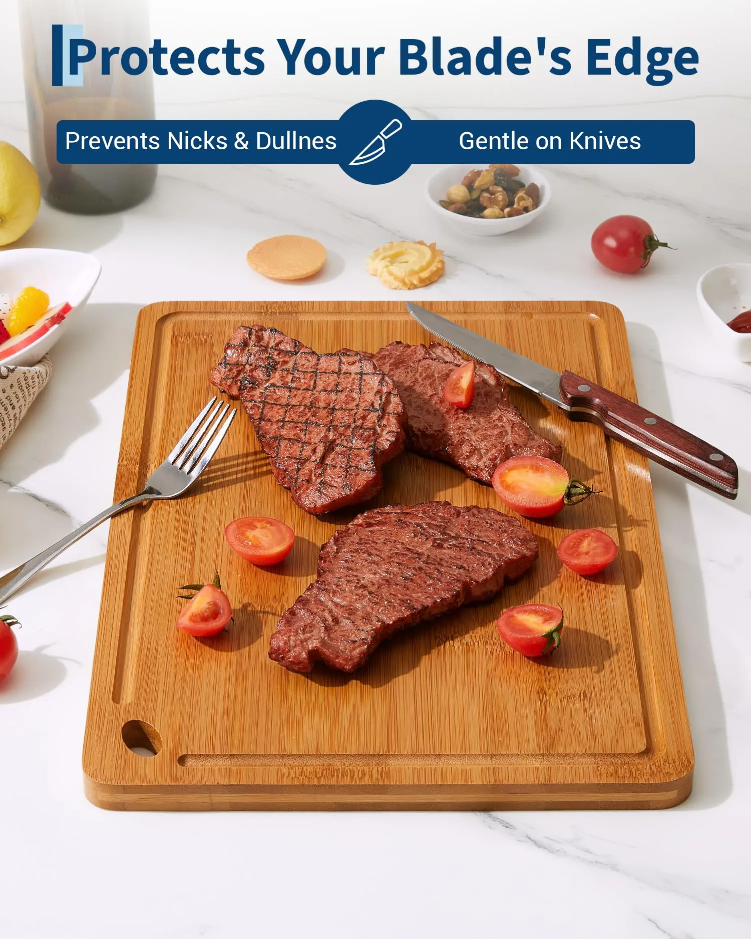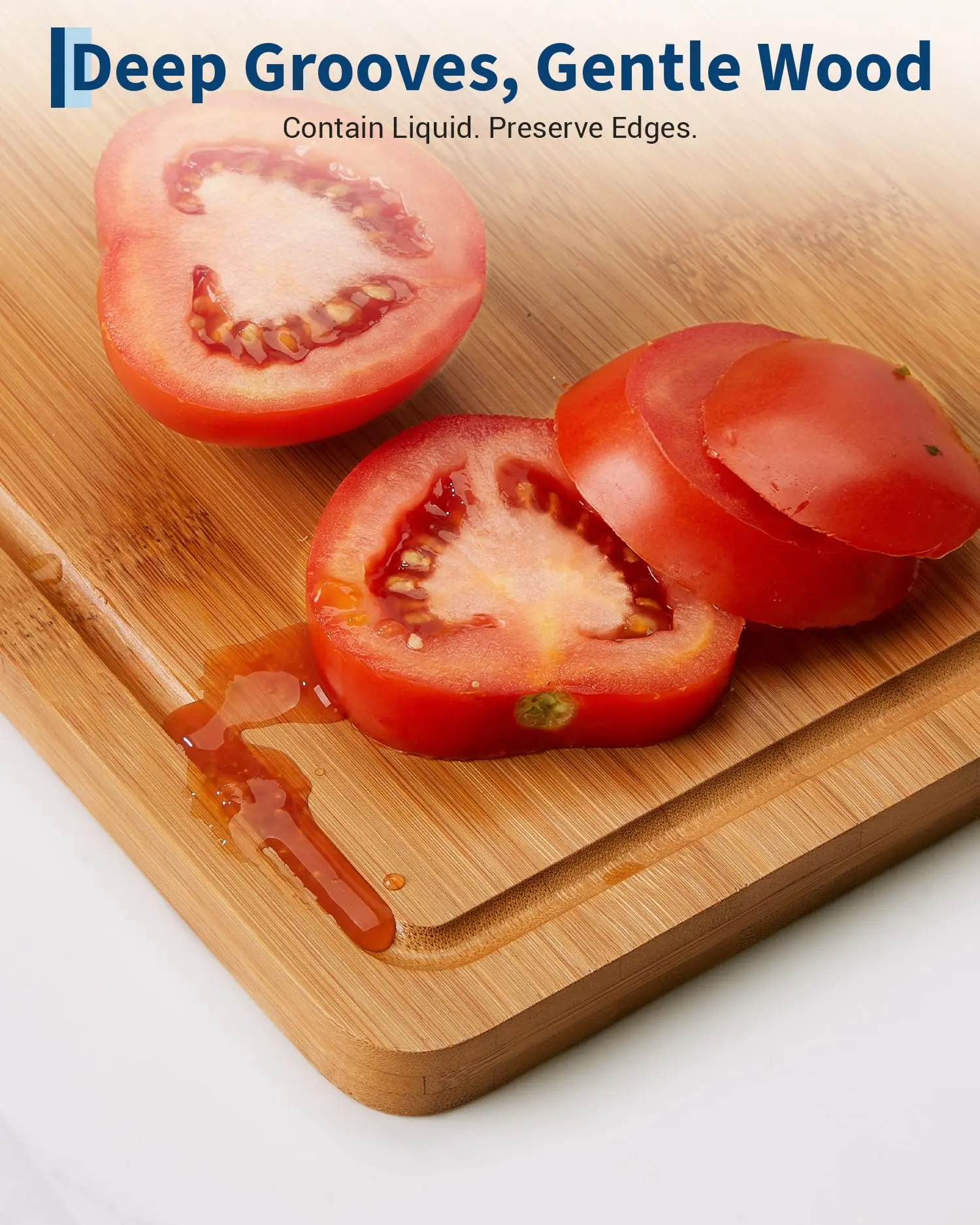 · Protects Knife Edges & Smooth Finish:Experience superb craftsmanship with a surface polished to an ultra-smooth, flat finish. This bamboo cutting board is meticulously crafted to be knife-friendly, protecting your blades from dulling and damage. The food-grade oil-treated surface resists scratches and marks, ensuring a long life for both your knives and this essential chopping board.