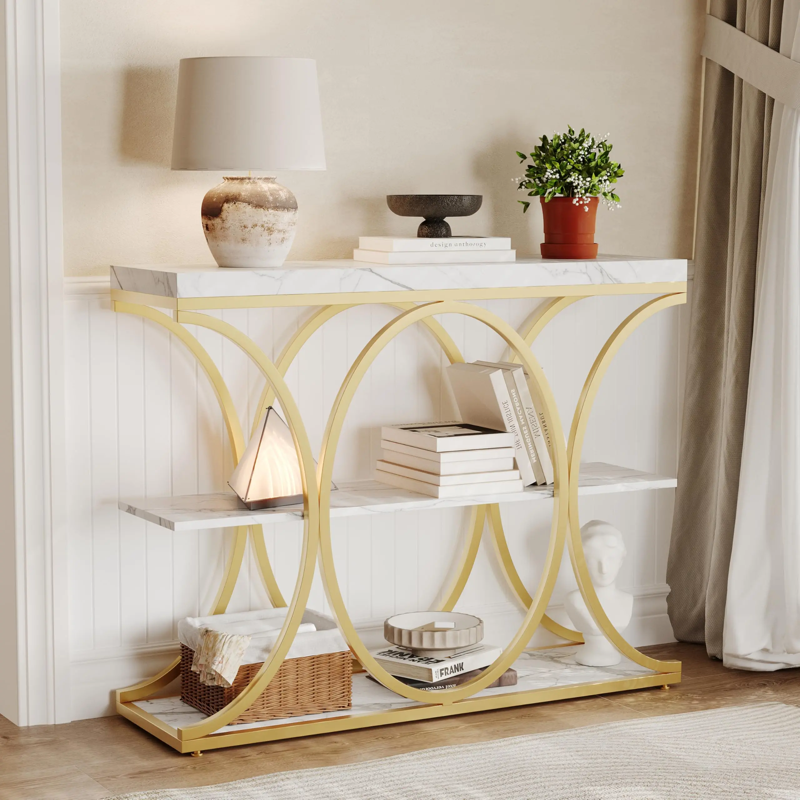 · 🗄️Stable "0"-Shaped Metal Frame with 2 Storage Shelves:Designed with double diamond-shaped metal frames and adjustable feet, this rustic console table ensures enhanced stability and floor protection. Featuring two spacious built-in shelves, it provides ample storage for books, décor, baskets, and more, keeping your space organized and tidy.