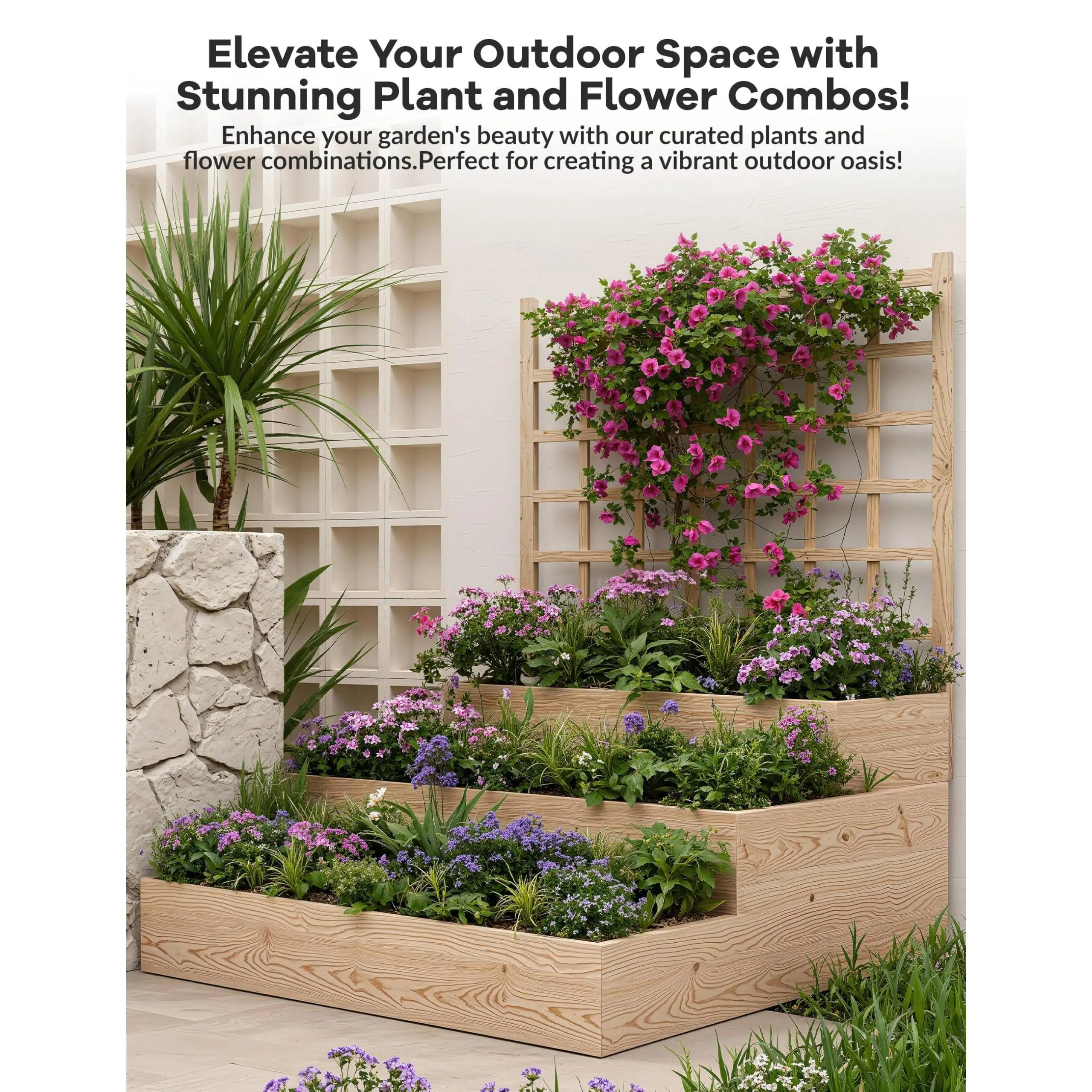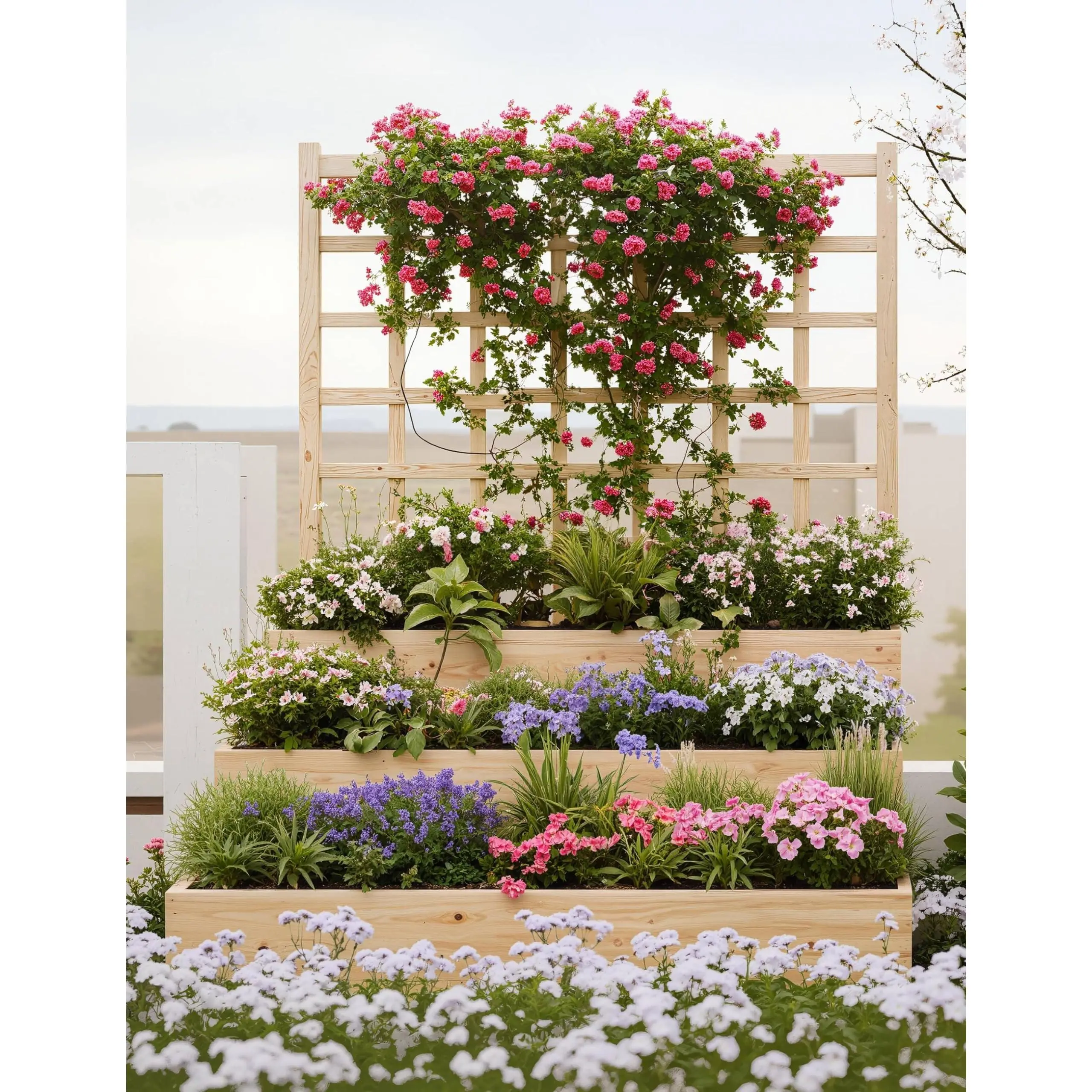 · 2,Sturdy Built-in Trellis for Climbing Plants: Equipped with a durable lattice trellis, this garden bed provides essential support for climbing plants like tomatoes, cucumbers, peas, and flowering vines. The trellis encourages vertical growth, improving air circulation and sunlight exposure for healthier yields. Additionally, the stylish design allows you to hang small baskets, fairy lights, or garden decor, blending functionality with aesthetic charm.