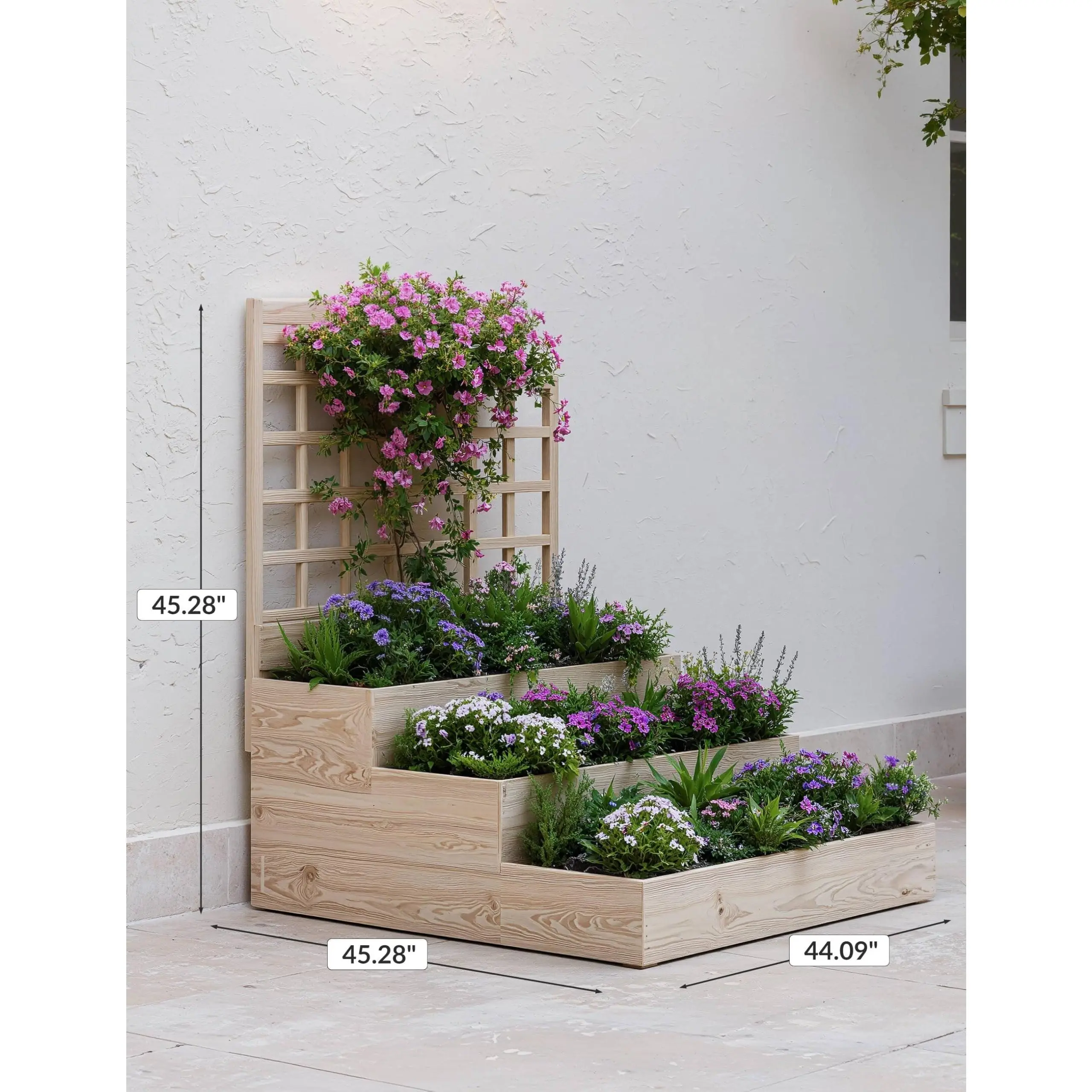 · 1,Spacious & Versatile Planting Design: This 3-tier raised garden bed features multiple planting levels, each with varying depths to suit different root systems and plant types. Whether you're growing deep-rooted vegetables like carrots or shallow herbs like basil, the tiered design ensures optimal soil space for healthy growth. The generous planting area allows you to cultivate a diverse garden—flowers, fruits, vines, and herbs—all in one compact structure.