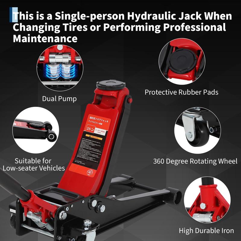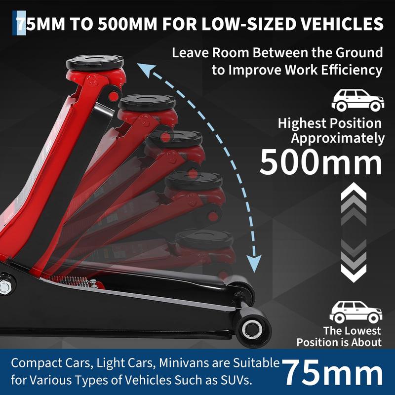 · Low-Profile Design with Rapid Lift: Featuring a low-profile design that starts as low as 3 inches, this hydraulic jack for car easily fits under vehicles with low ground clearance. The efficient dual-pump hydraulic system ensures fast lifting with fewer handle strokes, achieving a maximum height for versatile repair and maintenance work.