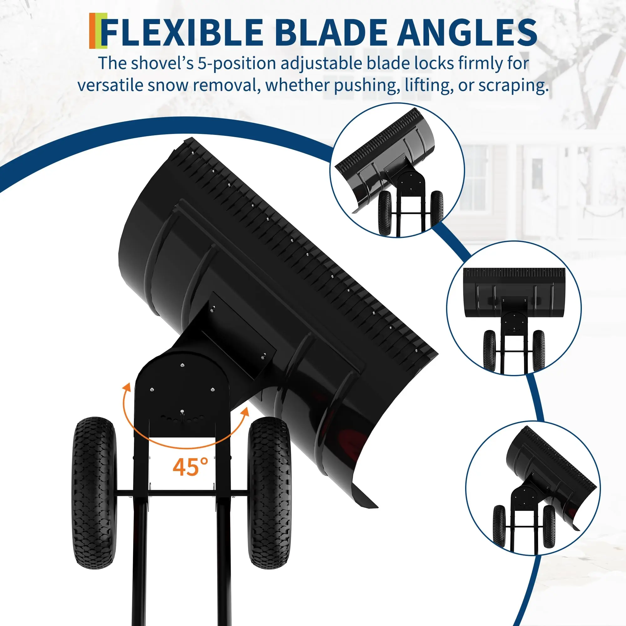 · 3,Versatile Blade Angles: The multi-angle blade locks into five positions, adapting to different snow depths and surfaces. Simply adjust the angle for optimal snow pushing efficiency, saving time and energy. This flexibility makes clearing driveways, sidewalks, and decks easier than ever before.