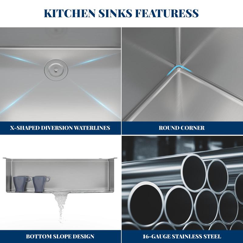 · 【Professional-Grade 16-Gauge Construction】 Manufactured with premium stainless steel, this sink features reinforced 16-gauge thickness for exceptional durability. The scratch-resistant brushed finish maintains its pristine appearance with minimal upkeep, offering superior resistance to stains and daily wear.