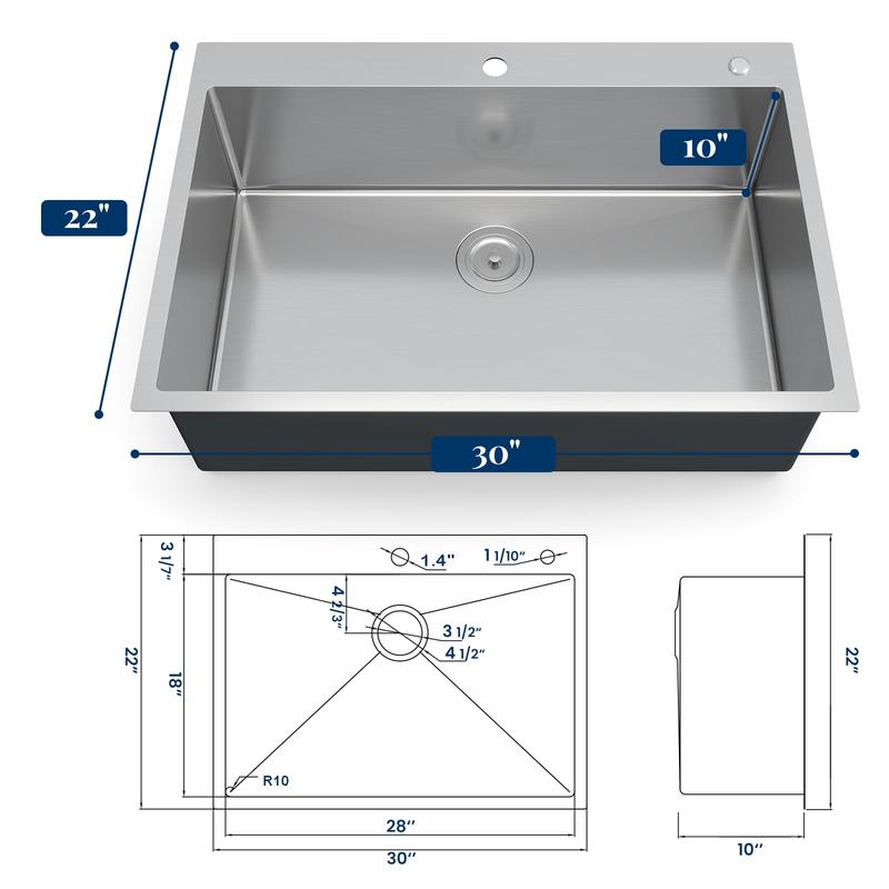 · 【30x22 Inch Premium Workstation Sink】 Boasting generous 30"L x 22"W x 10"D exterior dimensions and 28"L x 18"W x 10"D interior space, this deep single-bowl design effortlessly handles bulky cookware and multiple dishes. The 10-inch depth minimizes splashing, while rounded corners simplify cleaning and accommodate oversized pots.