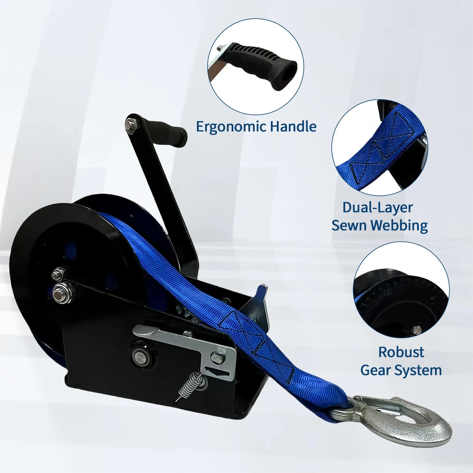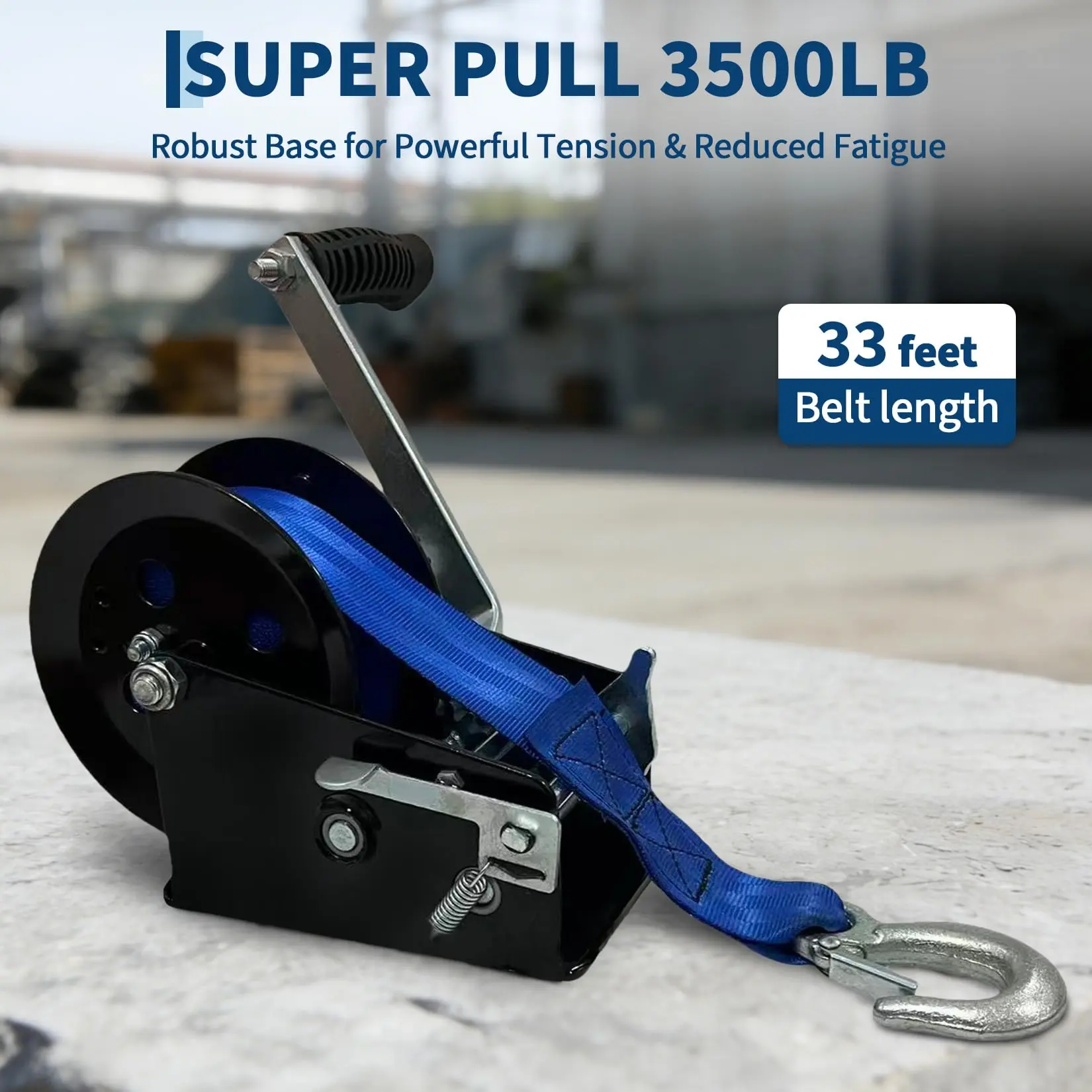 · ✔【3500 lbs Industrial-Grade Pulling Force】: Handle demanding tasks with confidence using this heavy-duty boat trailer winch featuring 3500 lbs of pulling power. The integrated 2-inch wide, 33-foot long strap and reinforced base maximize traction while dramatically reducing physical strain.